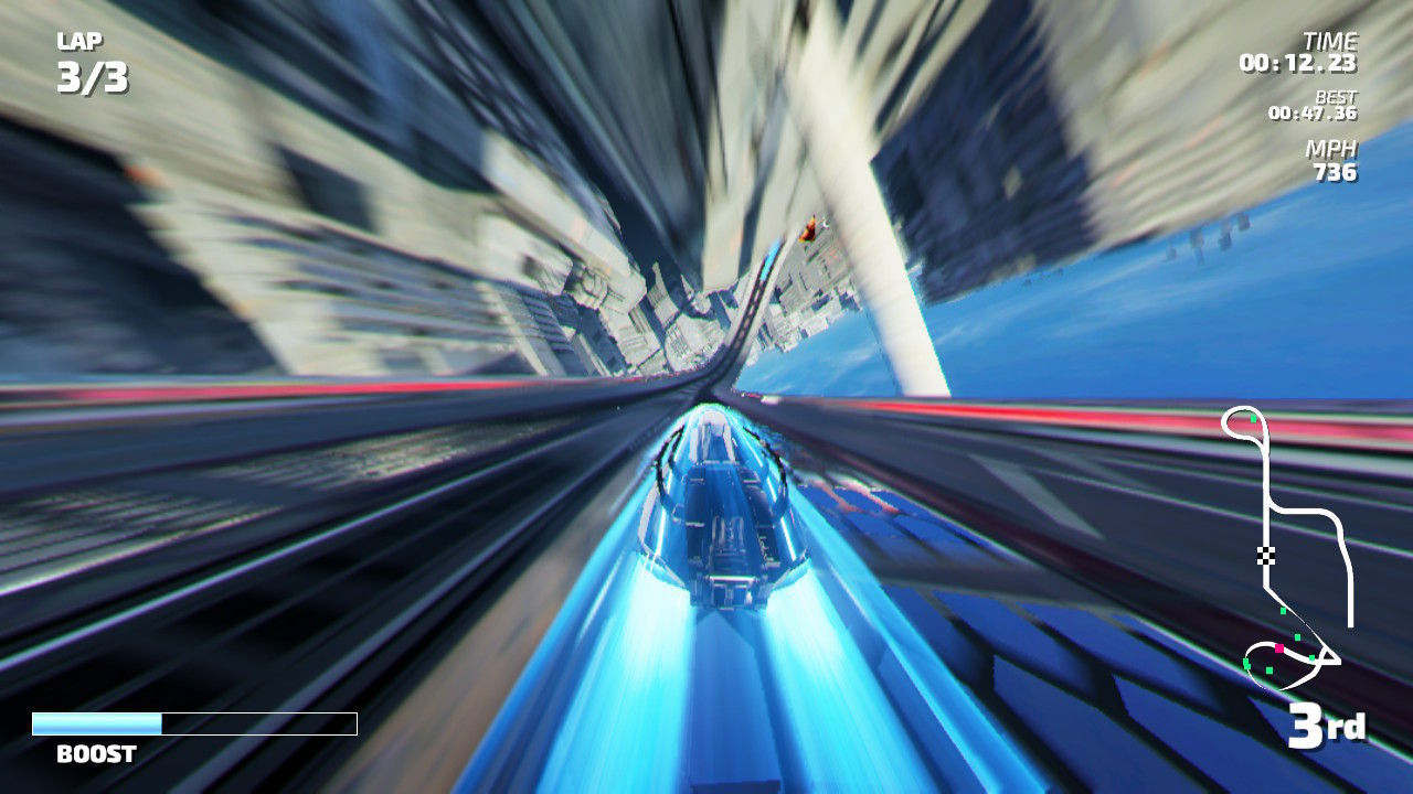 Y luego está el tema de las phases de las naves, que pueden ser azul y naranja. Esta dualidad es muy importante debido a que las zonas de turbo que se encuentran repartidas por cada escenario presentan un color determinado, siendo necesario hacer coincidir el tono de nuestra nave (o phase) para aprovecharnos del impulso extra, sucediendo justo el caso contrario si pasamos por dicha zona con la phase opuesta.
