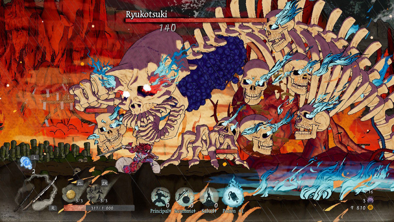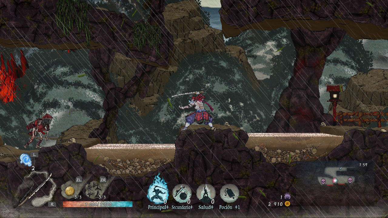 En los aspectos jugables tenemos un juego de acción 2D bastante clásico –mismamente, como Castlevania- que moderniza la fórmula con un desarrollo roguelike: cada vez que morimos, volvemos al mundo central para emprender de nuevo nuestro viaje. Comenzamos con una katana, pero los mapas –ligeramente enrevesados- incluyen un montón de botín para cambiar nuestro estilo de juego a gusto; la espada es nuestra arma estándar y se basta para la mayoría de situaciones, pero hay opciones con mayor alcance y otras que compensan sus ventajas con ataques más lentos. Cuando la situación se complique repetirás con intención de conseguir mejoras permanentes en el protagonista o las diferentes armas principales y secundarias, un grindeo que nos hace más fuertes poco a poco.