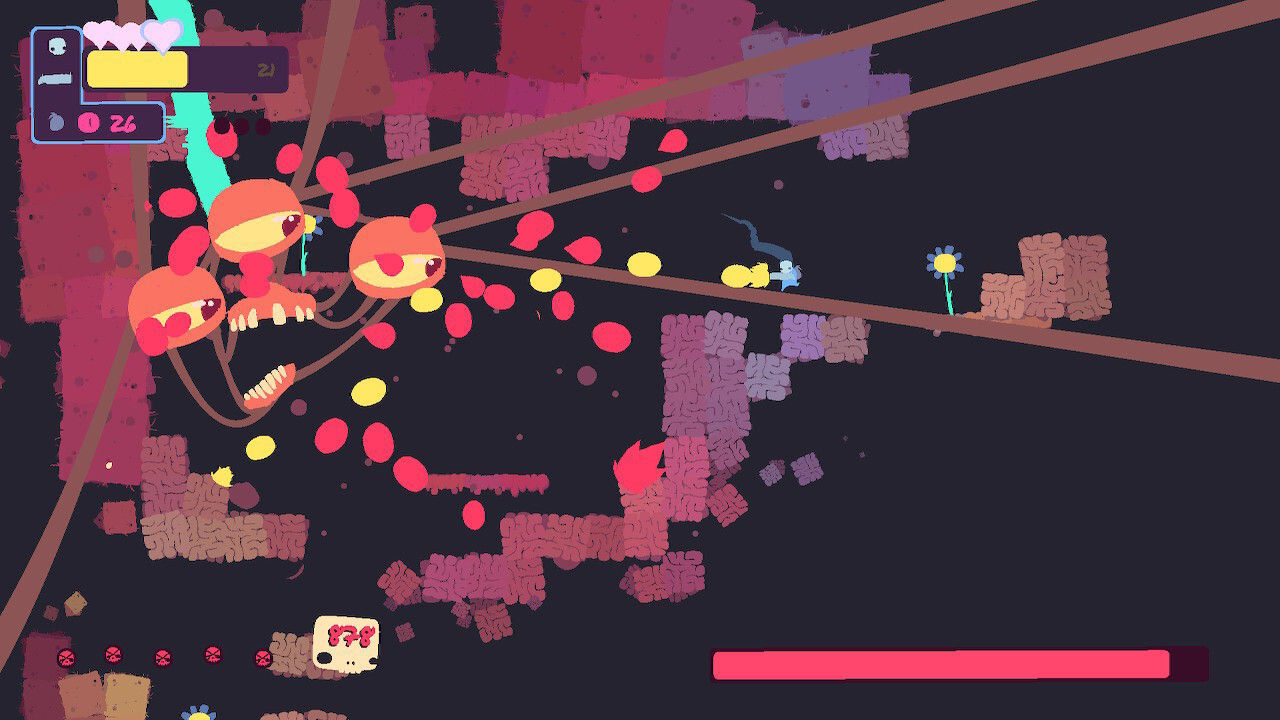 Nuestro personaje tiene una serie de habilidades básicas (salto, disparo y esquive/impulso), pero estas pueden verse ampliadas o modificadas por potenciadores que encontramos durante nuestras partidas (doble salto, más munición...) o que podemos comprar en una tiendecita que nos aguarda antes de cada jefe.