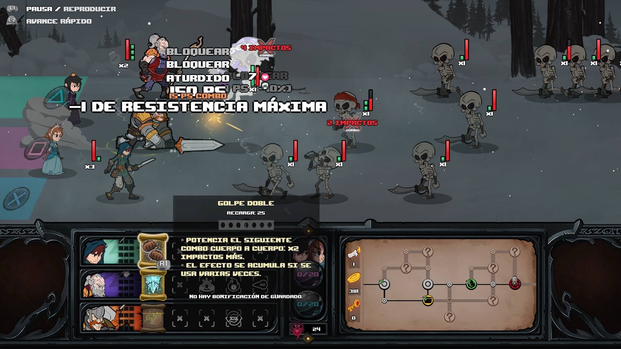 En este título no hay exploración como tal, sino que funciona progresando por una serie de nodos donde aparecen los combates u otros eventos, caso de cofres y vendedores. Es bastante simple y menos divertido que la solución del poco conocido –y estupendo juego de estrategia- Grand Kingdom, que nos proponía avanzar por un tablero. Al menos, Has-Been Heroes nos permite tomar nuestra ruta preferida en cada intersección, pero se trata de una generación aleatoria y por tanto la mayoría de ocasiones lo mejor consiste en investigar la mayor parte del mapa para obtener los mejores recursos –y los necesitarás si quieres tener oportunidades contra los jefes finales-.