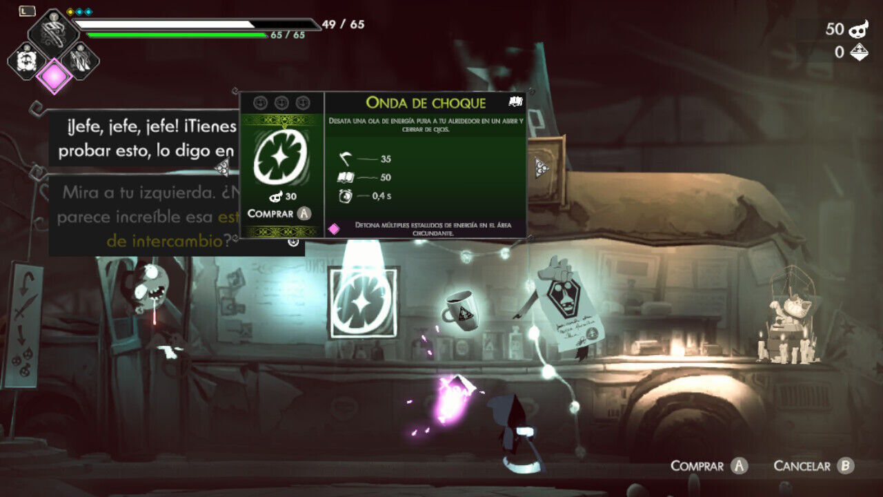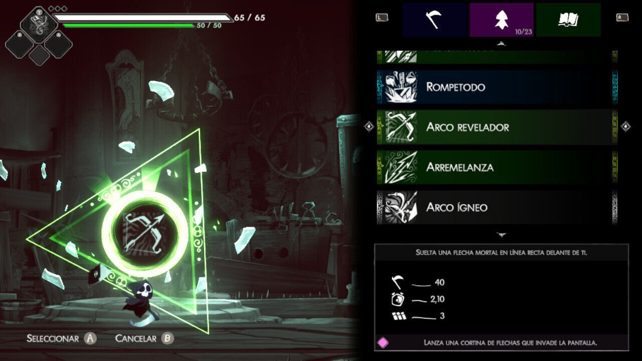Lógicamente no estamos ante un juego sencillo, y no porque los enemigos planteen un enorme desafío, sino porque muchas veces se trata de una carrera de fondo y una serie de errores te llevarán de vuelta a tu despacho más pronto que tarde. La muerte forma parte de su planteamiento, nunca mejor dicho, y la clave está en que cada derrota aporta alguna ayuda extra o progreso para que la siguiente partida que nos dé más oportunidades. Además existen varias armas secundarias –algunas absurdas- para complementar nuestra característica guadaña y sus variantes, lo que se traduce en abundantes combinaciones de combos y estrategias cuando se suman los tipos de maldiciones –por ejemplo provocar envenenamiento con cada ataque- o magias que consumen su barra de maná –de recarga muy rápida-. Claro que a veces las ayudas pasivas conllevan también una desventaja para equilibrar la balanza.