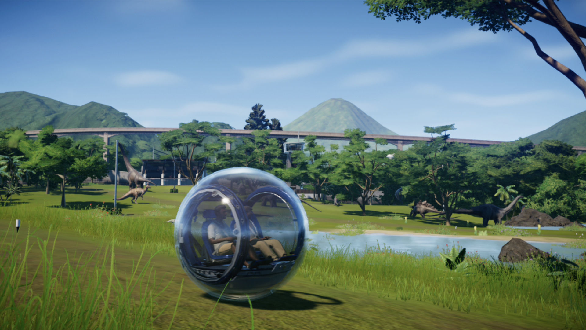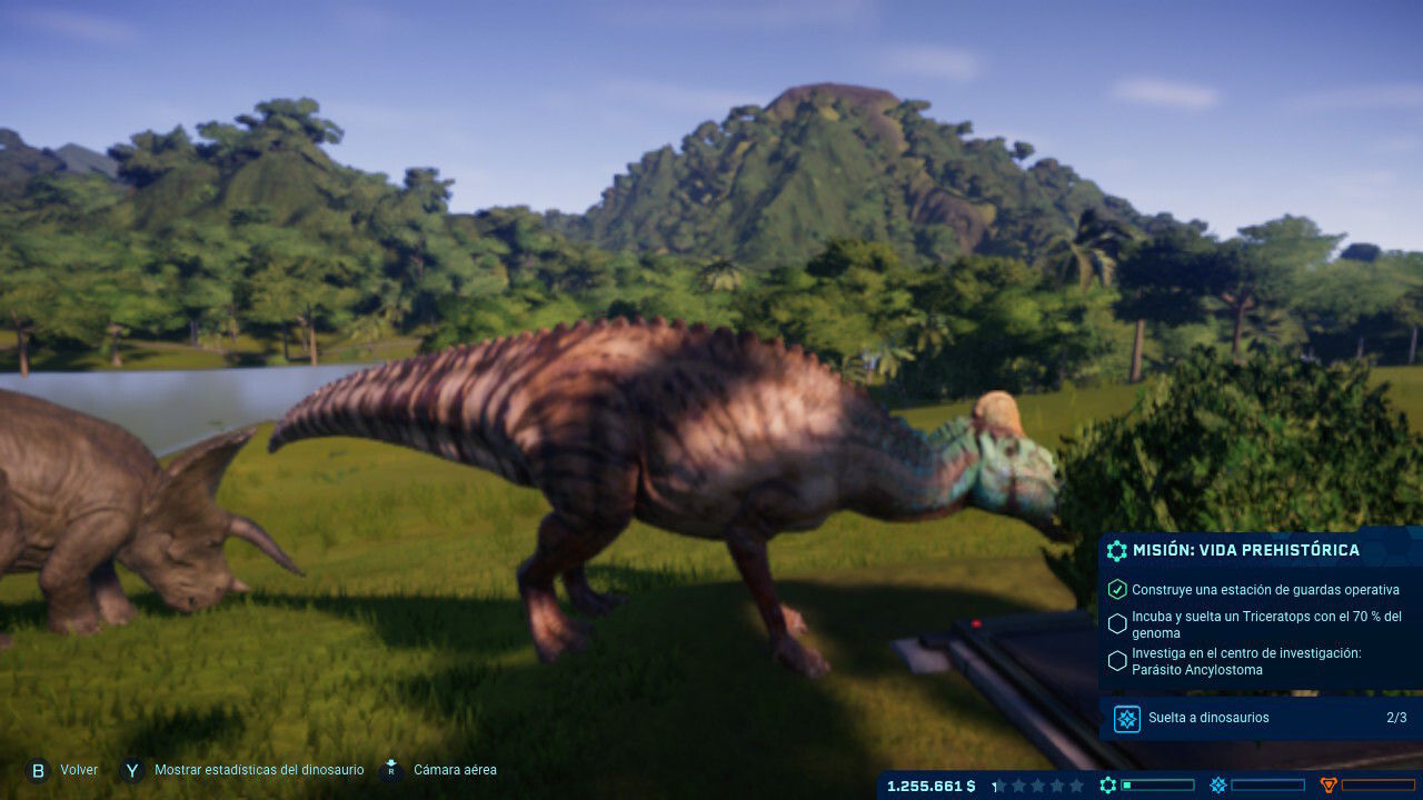 Una vez los liberamos en su recinto, el juego nos presenta una espectacular secuencia de vídeo en la que se muestra al animal prehistórico en cuestión, interactuando en el entorno o relacionándose con otros de su misma especie. Son 68 especies de dinosaurios en esta edición completa para Nintendo Switch, que se dice pronto, desde el clásico Tyrannosaurus rex al Velociraptor mongoliensis, pasando por el Triceratops horridus o el Brachiosaurus altithorax. A todas ellas hay que sumarle una cantidad ingente de skins y variaciones cromáticas, que pueden ofrecernos desde aspectos nostálgicos como los de las primeras películas, a colores y tonalidades más cercanas a las secuelas más recientes. Jurassic World Evolution hacía algo muy bien en su día, y que se mantiene en Nintendo Switch: que sientas que estás viendo a un animal de verdad. Cada dinosaurio tiene su propio comportamiento, y como si fuésemos expertos en etología, tendremos que comprender qué es lo mejor para ellos, estudiando sus hábitos en detalle, y buscando que estén cómodos durante su vida en el parque. Los carnívoros serán agresivos y territoriales -casi todos los terópodos nos causarán muchos problemas-, por lo que deberán estar en recintos apartados y con grandes medidas de seguridad, mientras que los herbívoros serán más apacibles y fáciles de dominar y controlar. En pocas horas, tendremos un buen puñado de dinosaurios pululando por el parque, así como un gran número de visitantes pagando religiosamente su entrada para verlos.