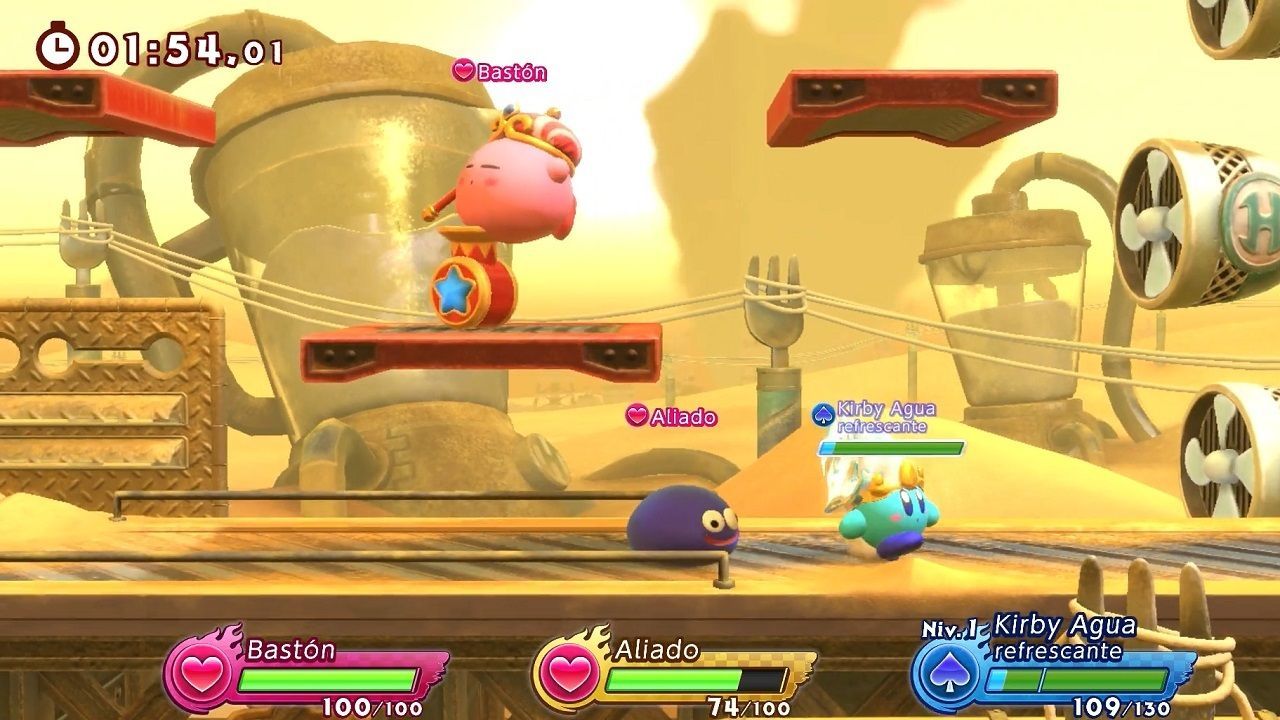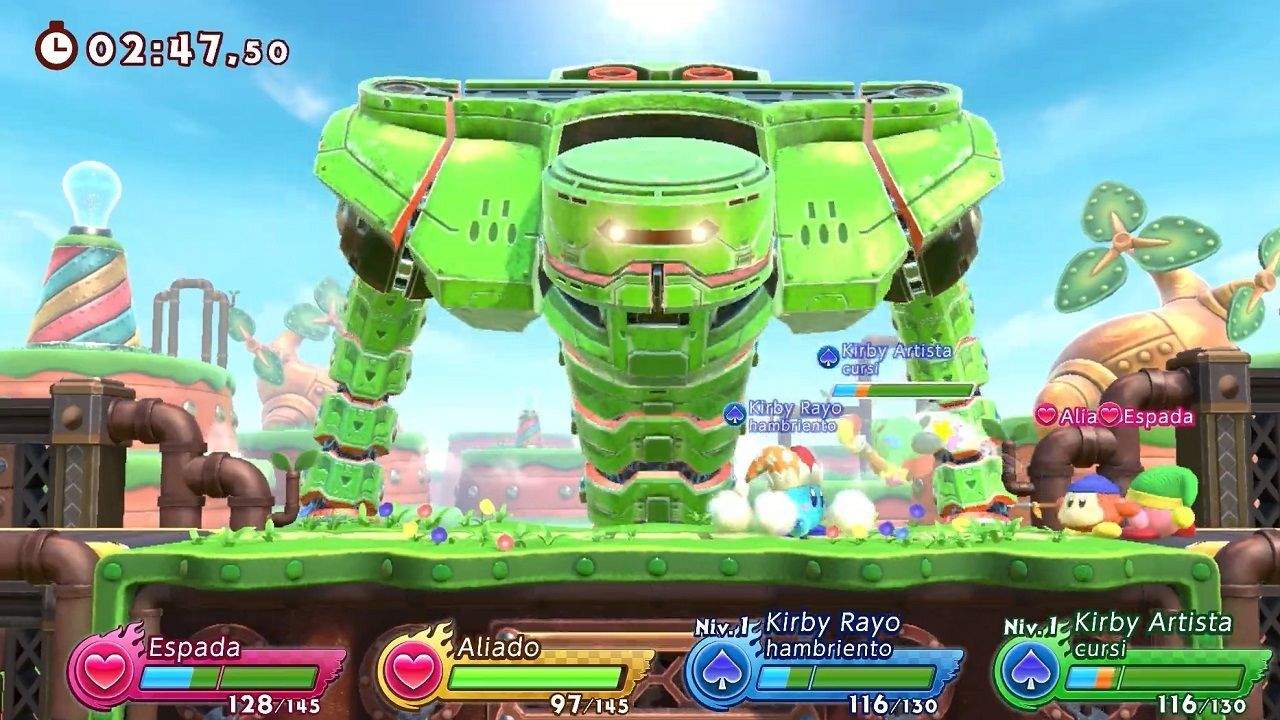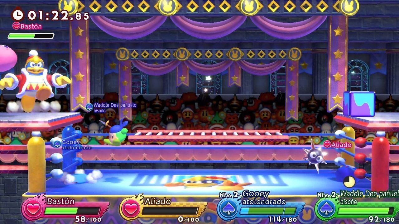 El sistema de control no puede ser más simple. Se emplean cuatro botones básicos que nos permiten saltar, atacar a nuestros oponentes, protegernos y absorber y lanzar al resto de rivales, seña de identidad de Kirby. Un manejo que a pesar de que es un calco del mismo plasmado en Super Smash Bros ha sido algo simplificado, si bien y gracias a las distintas habilidades de los diferentes Kirby, nos permite llevar a cabo una generosa gama de acciones. A pesar de que al comienzo solo es posible escoger entre una pequeña representación de personajes, conforme avanzamos podemos ir obteniendo puntos de luchador para habilitar hasta 17 Kirby distintos más algunos invitados adicionales más, como el gran aliado de la bola rosa Waddle Dee. Kirby Espada, Pintor, Yoyó, Martillo o el nuevo Luchador (de Wrestling) son algunos de los diferentes tipos de Kirby que podemos llegar a controlar, y todos ellos poseen su elenco de ataques y acciones exclusivas. Una oferta más que generosa en este sentido.El desarrollo de los combates nos ha parecido muy divertido y tremendamente dinámico. Y es que debido a la celeridad de desplazamiento y de reacción de los personajes, la pantalla se llena de ataques especiales, espadazos, ítems, saltos y efectos de todo tipo. Una propuesta frenética que alcanza su cénit cuando en ella se dan cita cuatro personajes a la vez. Está claro que estamos ante un título que nos ofrece su mejor cara cuando en él confluyen cuatro jugadores, y sin ser un título multijugador puro, si optamos por disfrutar de él en solitario los niveles de diversión se ven un tanto reducidos, al menos bajo nuestro punto de vista. Tened esto último en cuenta.