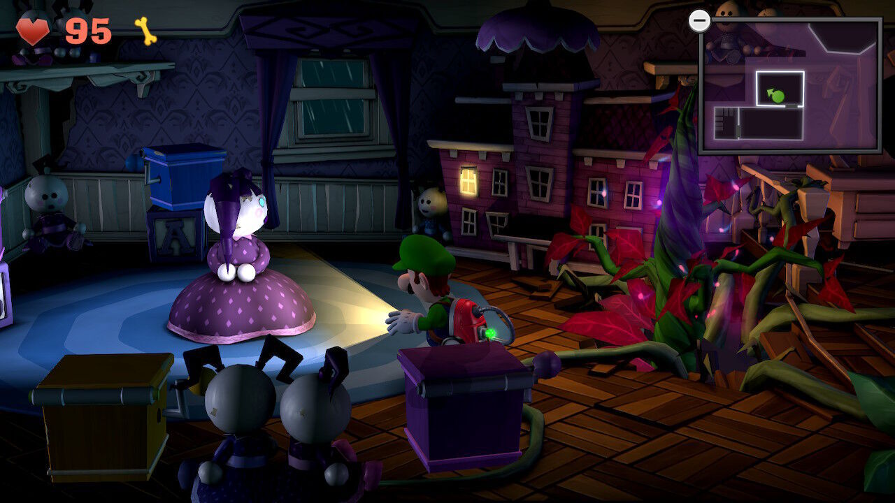 De este modo, para progresar en la historia nos tocará cumplir los diversos objetivos que nos vayan indicando, como limpiar todas las habitaciones de telarañas, cazar unos fantasmas en concreto, perseguir a un ectochucho o guiar a un Toad hasta la salida, algo que se aprovecha para hacernos recorrer las mismas estancias con cambios y sorpresas que van variando dependiendo de la misión en la que nos encontremos.