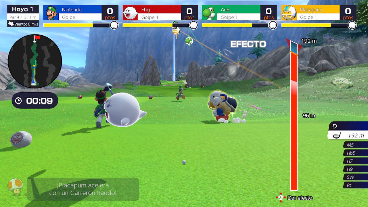 Eso sí, esto es, ante todo, un Mario Golf, por lo que tampoco nos faltarán un buen número de elementos fantásticos en el caso de que queramos alejarnos de la vertiente más pura y realista de este deporte, como los tiros especiales. A medida que se vayan desarrollando los partidos iremos rellenando un medidor que nos permitirá ejecutar la técnica especial de nuestro personaje, las cuales suelen tener todo tipo de efectos perjudiciales para nuestros rivales que van desde cosas tan simples como mover de sitio sus pelotas hasta poseerlas para que a la hora de golpear hagan curvas del todo impredecibles. Evidentemente, esto le da un toque táctico muy interesante al desarrollo de las partidas, ya que escoger el momento ideal para usar nuestra habilidad puede marcar la diferencia entre una victoria y una derrota.