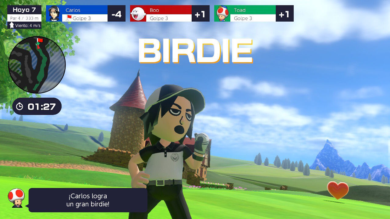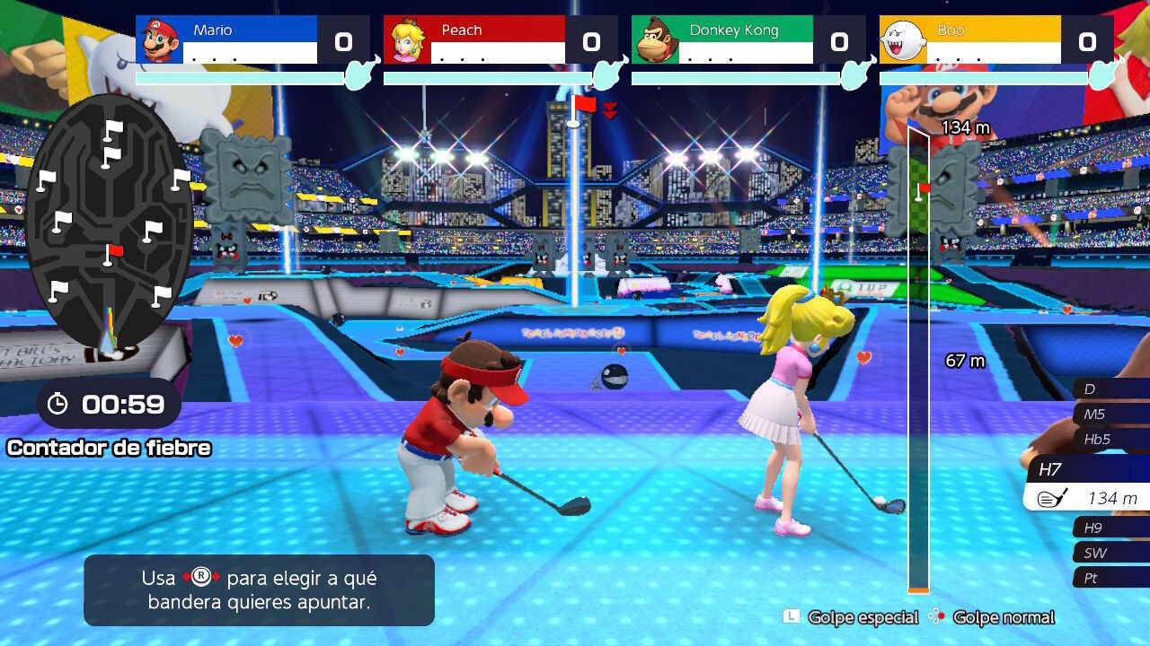 Tampoco nos podemos olvidar de Batalla de Golf, una modalidad en la que deberemos competir por "conquistar" hoyos antes de que lo hagan nuestros contrincantes en un par de campos con un diseño muy peculiar y donde podremos recoger cajas de objetos al más puro estilo Mario Kart para entorpecer al resto de jugadores. A pesar de lo bien que suena, es el modo que menos nos ha convencido por el caos que suele reinar en sus partidas. Cumple para algún que otro partido rápido con los amigos de vez en cuando, pero poco más.