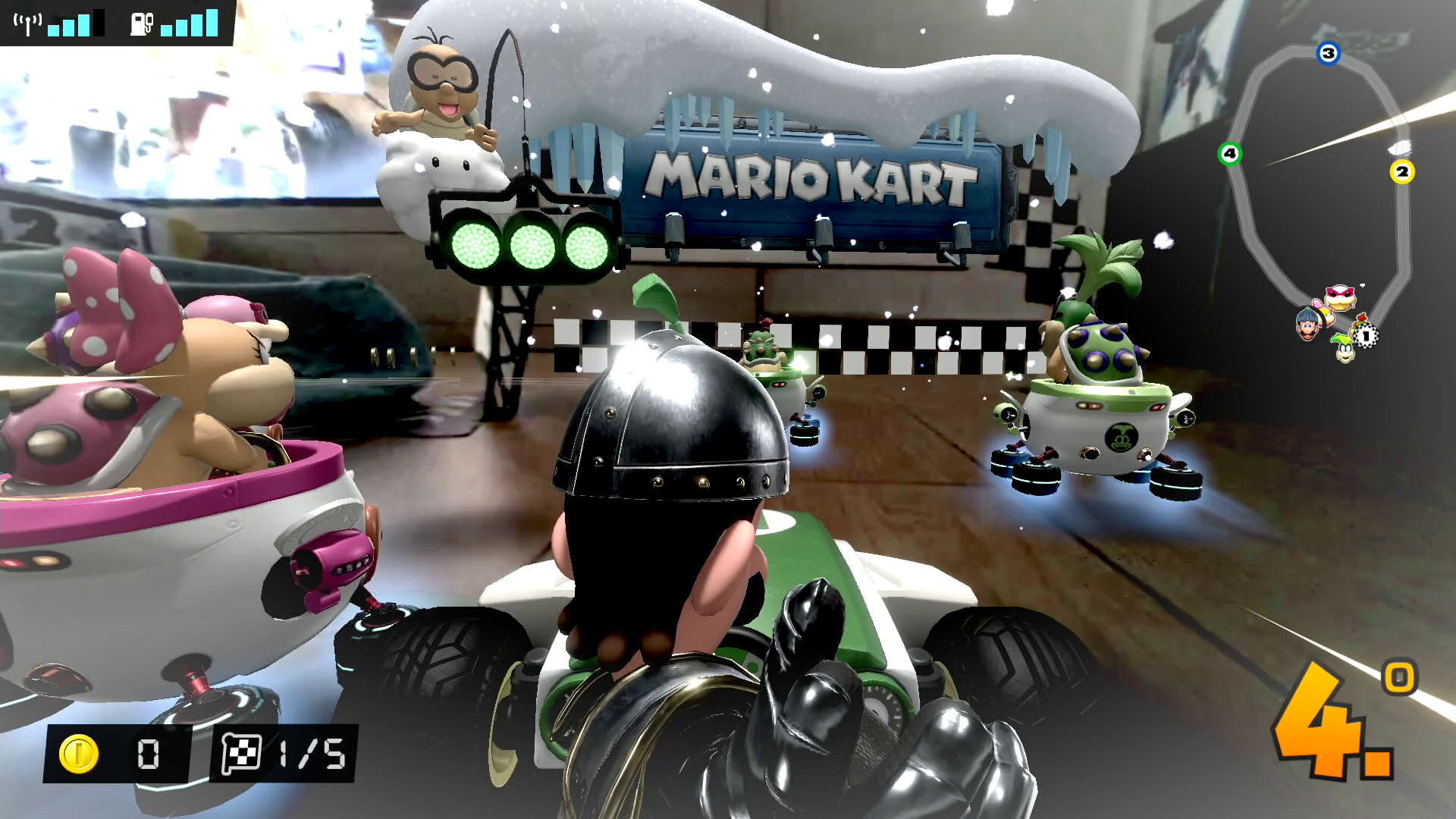 Para rematar, tampoco es que venga precisamente cargado de contenidos, ya que los únicos modos con los que cuenta son Grand Prix (superar copas de tres carreras con los entornos y arcos predeterminados), Contrarreloj y Carrera personalizada. A esto hay que sumarle un modo multijugador local para hasta cuatro jugadores en el que cada piloto necesita su propia consola y su kart (no existe opción de pantalla dividida). Evidentemente, todas estas modalidades pueden ser jugadas en las cuatro cilindradas habituales (50cc, 100cc, 150cc y 200cc), las cuales modificarán la velocidad del kart, además del tradicional Modo Espejo. Aquí nos vemos obligados a comentar también que existe un sistema de progresión muy ligero que nos irá recompensando a medida que acumulamos monedas durante las carreras con nuevos diseños para nuestro personaje y el kart, así como sonidos para el claxon.