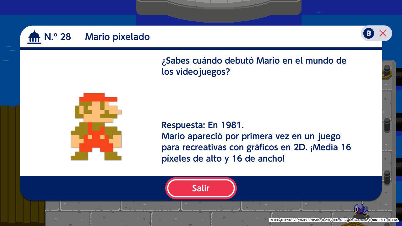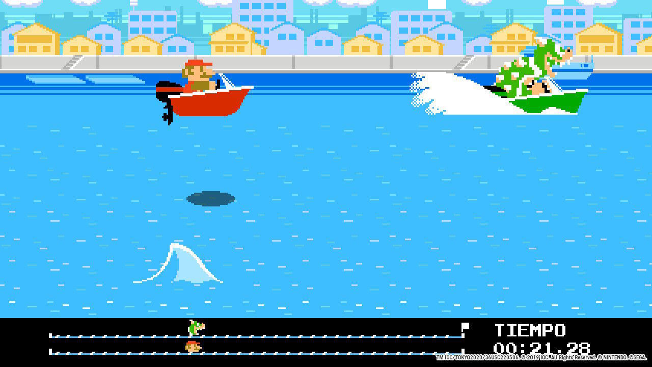 Como si se tratara de un título de plataformas clásico, debemos ir guiando a unos (Mario y Sonic principalmente) y a otros (Luigi, Tails, Daisy y muchos otros más) por un hub central que actúa como minimapa. Y como ya imaginaréis, en lugar de estar ante un escenario de fantasía, en este caso la ciudad nipona sirve como epicentro para albergar las aventuras de estos personajes tan simpáticos… ¡y por partida doble! Eso es, porque dicho mapeado se desdobla en el Tokio actual y el correspondiente al año 1964, pudiendo ir desplazándonos por diversos puntos de interés de la ciudad, desde la famosa torre de Tokio a los diferentes estadios y pabellones que albergan las diferentes pruebas deportivas. Y en cada uno de estos lugares es necesario superar diversos desafíos y pruebas, algunas muy llamativas, sobre todo las que tienen lugar en la versión retro de la historia. Cuatro o cinco horas de duración para una modalidad bastante simpática y amena.