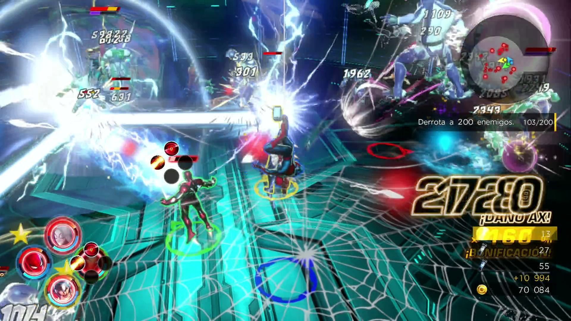A efectos prácticos, solo tenemos la posibilidad de realizar un combo básico de ataques flojos que puede ser rematado con un golpe fuerte, así como cuatro movimientos especiales que consumen parte de nuestra barra de energía. Por supuesto, también podemos defender y esquivar, y dependiendo de a quién encarnemos tendremos diferentes posibilidades a la hora de movernos, como volar o balancearnos con telarañas.