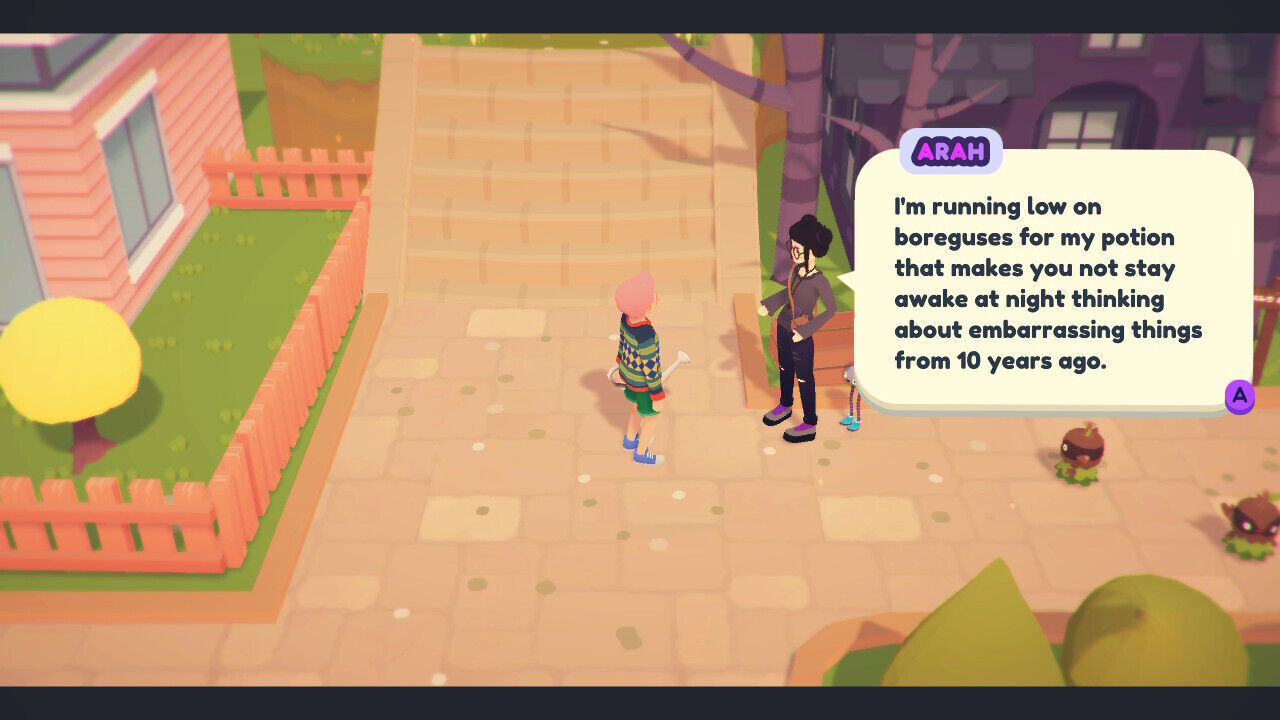 La parte social de la experiencia, aunque sobre el papel pueda sonar a la de títulos como Story of Season, nos ha recordado más a la de Animal Crossing. Las relaciones sociales no están ligadas a regalos u objetivos, sino a charlar con los amigos que vamos haciendo por el camino. Así, igual que en la saga de Nintendo se nos recompensa el conversar con líneas de diálogo graciosas o con mensajes que nos permiten conocer mejor la personalidad de cada animal, en el título de Glumberland cada día varios de los personajes principales de Badgetown tendrán algo nuevo que decir. Tras cada conversación, avanzará el progreso en el nivel de amistad, y al aumentarlo nos darán pegatinas y otras recompensas poco jugosas. El premio está en la charla en sí: cada frase oscila entre lo absurdo, lo adorable y el tweet; es un juego muy de nuestro tiempo en tanto que habla desde la gracieta y lo irónico sobre los problemas mentales, la explotación laboral, la falta de perspectivas a futuro y muchos otros temas que apretujan a toda una generación.