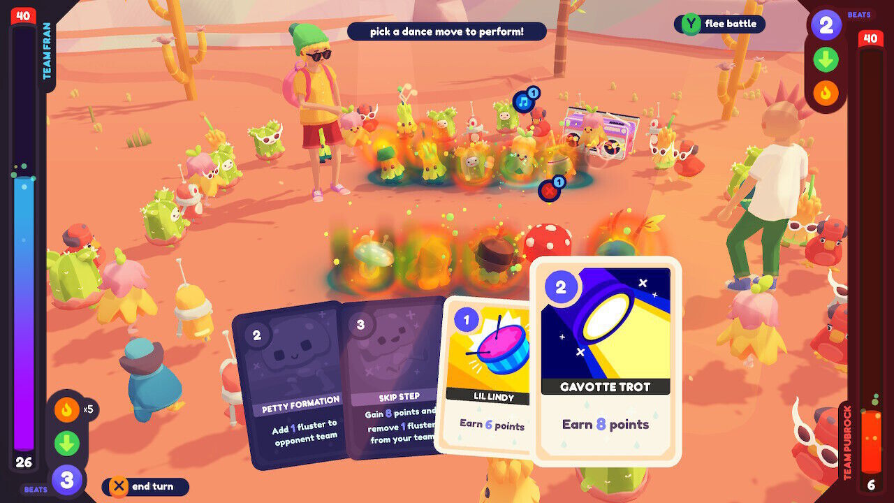 La parte de colección de criaturas y de combates por turnos es la que parecería que más desentonaría en la fórmula, pero no es el caso, sino que es la que cohesiona la propuesta. Nada más llegar a Badgetown nos dan nuestro primer ooblet y nos enseñan cómo funciona el sistema de combate por turnos, representado con un baile en el que cada movimiento es una carta. El objetivo es llegar a la cantidad de puntos indicada antes que el rival. Cada carta tiene un coste de ritmo; algunas nos dan puntos, otras hacen que los siguientes cartas den más puntos o hacen lo opuesto en el lado del contrario, las hay que meten naipes inútiles en el mazo del rival o que aturden a un ooblet aleatorio durante equis turnos, por citar algunos ejemplos.