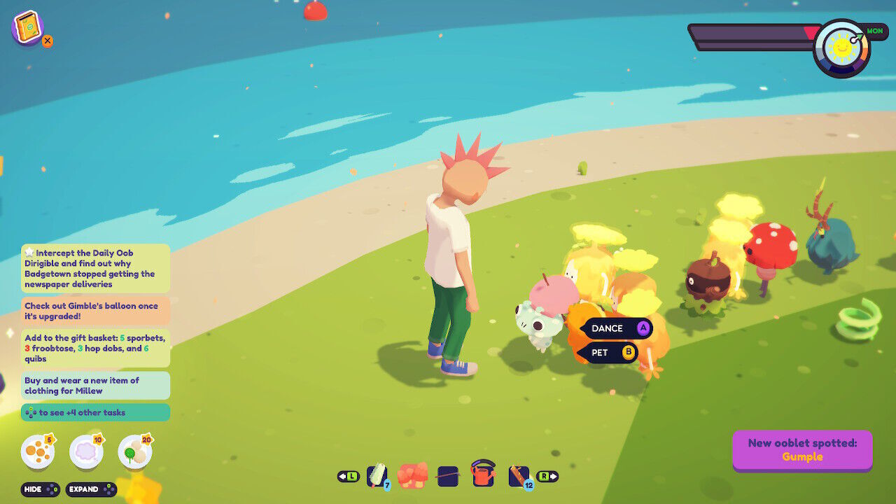 Lo interesante es cómo la obtención de ooblets, algo que haremos a veces por progreso y a veces por coleccionismo ( hay un equivalente a la Pokédex y hay criaturas con distinto color y brillantes), se mezcla con la gestión del huerto. Los ooblets no se capturan, sino que se plantan, y para obtener su semilla hay que ganar en una batalla de baile a los que son salvajes. Para que quieran combatir necesitamos darles cierta cantidad de una planta concreta e incluso platos preparados. A su vez, hay utensilios para el huerto que son operados por los ooblets que tengamos en él, y una zona en Badgetown que vamos ampliando ofreciendo los monstruitos (y sus semillas) que nos pidan, lo que a su vez nos da acceso a frutos y verduras que no se encuentran en otros lugares.