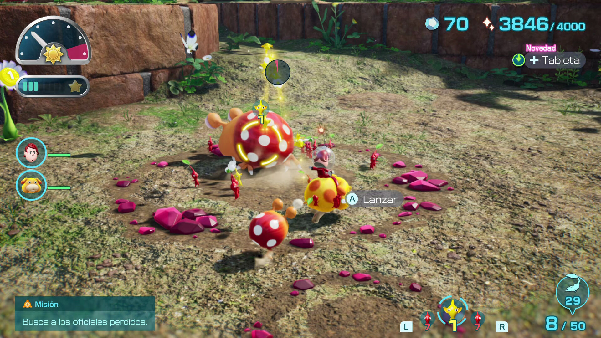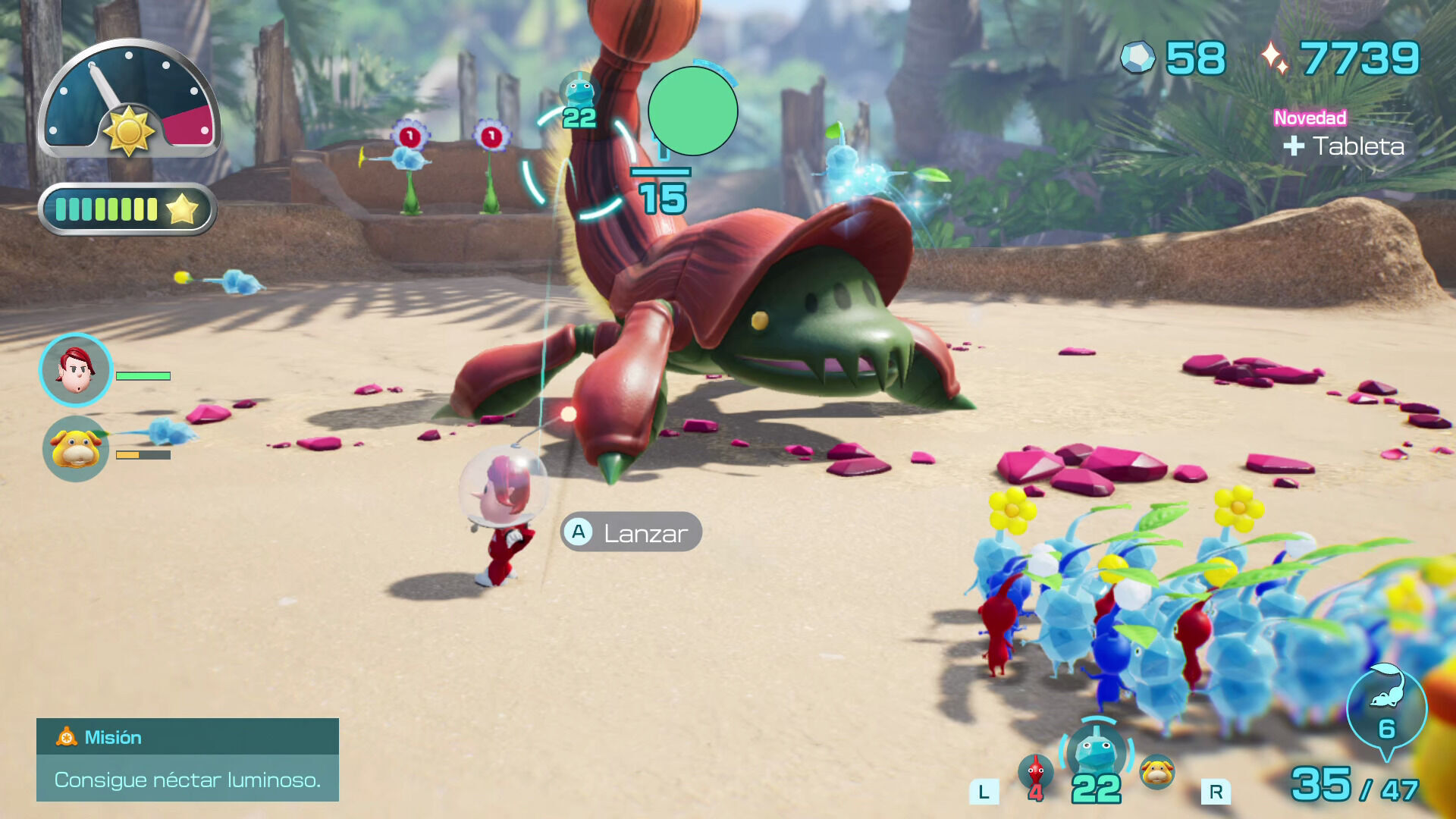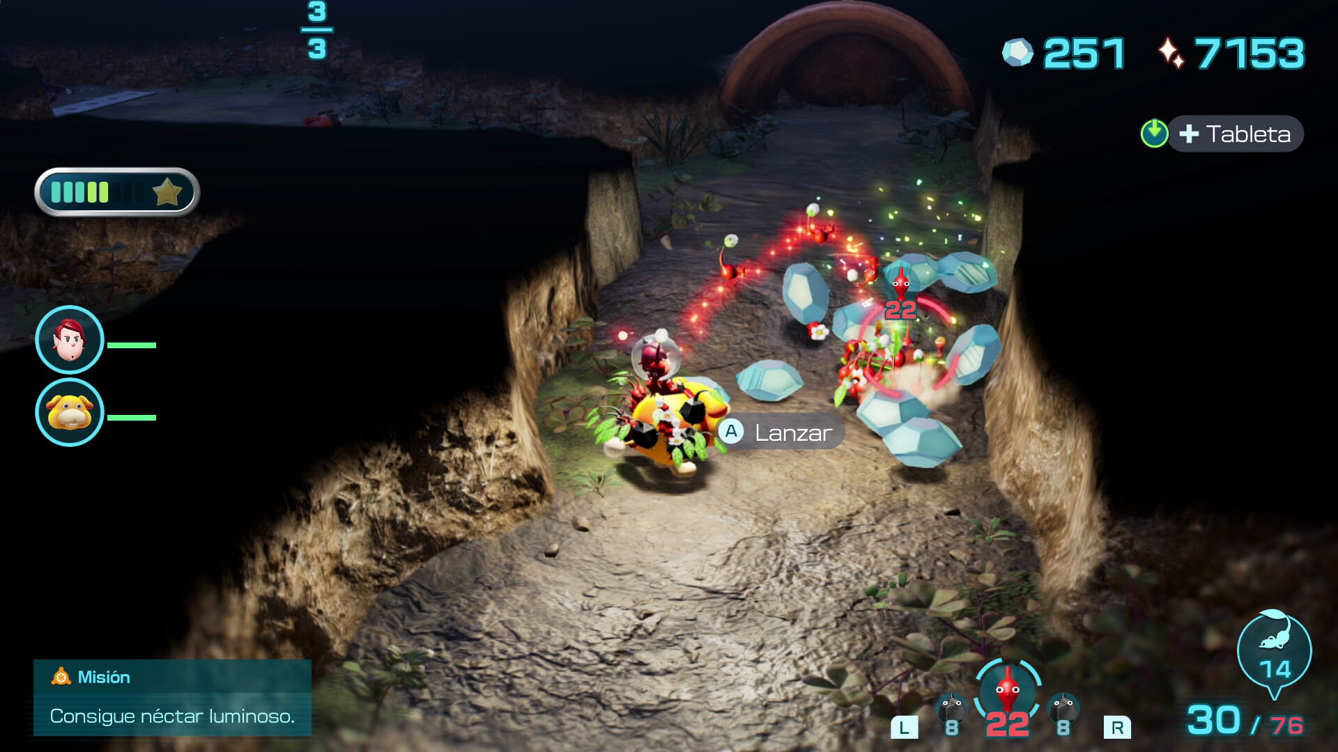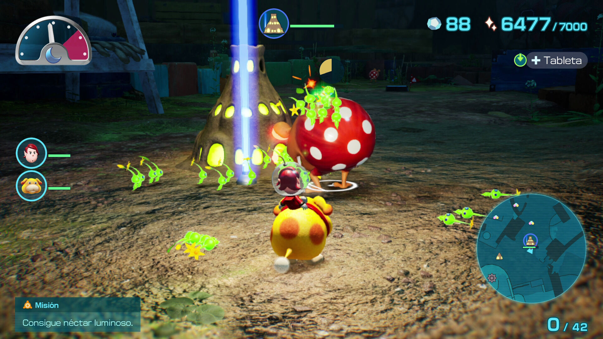 Lo realmente importante es que el bucle jugable que se crea sigue siendo muy divertido, ya que querremos aprovechar nuestras incursiones diarias para intentar realizar la máxima cantidad de cosas que podamos, por lo que la mayor diferencia es que ahora somos nosotros quienes marcamos el ritmo. Además, el modo en el que progresamos y desbloqueamos nuevas funciones, mejoras y características es muy gratificante, algo que resulta especialmente cierto durante la primera mitad de la aventura, donde celebraremos cada pequeño descubrimiento que hagamos, ya sea un tesoro para aumentar la cantidad de energía de nuestra nave y poder llegar a una nueva región inexplorada, nuevos tipos de Pikmin cuyas habilidades nos permitirán enfrentarnos a nuevos desafíos, cebollas con las que aumentar el número máximo de tropas que podemos desplegar o la entrada a una mazmorra donde rescatar a otros astronautas perdidos.