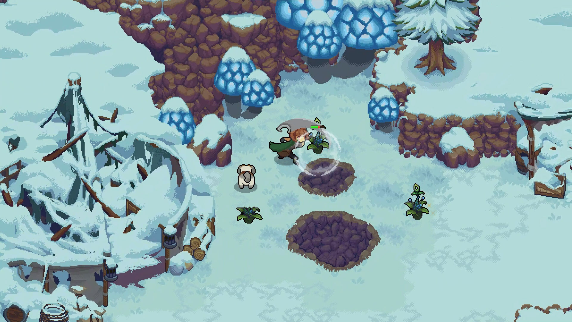 Una vez que tenemos el diagnóstico completo nos adentramos en las tres grandes áreas -un bosque, una montaña nevada y un desierto- con la meta de conseguir los materiales necesarios para la elaboración de nuestros brebajes. Al principio solo podremos acceder a la zona boscosa, aunque a medida que nuestra reputación aumenta el alcalde nos otorga una insignia de aprobación que nos permite movernos a lugares más inhóspitos para explorar los rincones más escondidos de la isla, enfrentarnos a nuevos peligros y conseguir recursos más raros y escasos. Estas localizaciones no son, por regla general, demasiado extensas o laberínticas, aunque sí son lo suficientemente grandes como para que no nos vengan mal las señalizaciones del minimapa ubicado en la esquina de la pantalla, ni tampoco las banderas de teletransporte repartidas por todo el mapa.