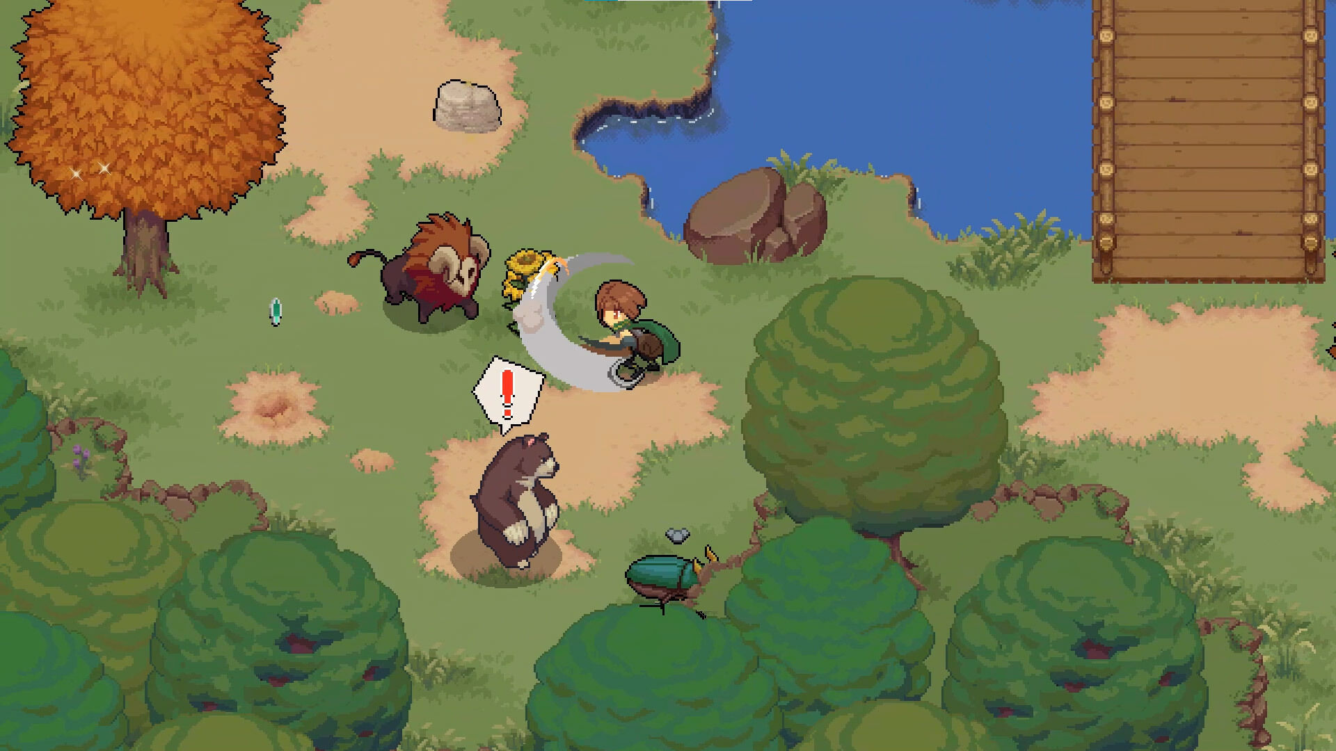 Las pequeñas dosis de acción y lucha en Potion Permit no brillan al mismo nivel que los otros componentes de la obra por diversos motivos. El primero de ellos es que, salvo en contadas excepciones, será indiferente con qué arma ataquemos a los enemigos para derrotarlos ya que el manejo de estas es prácticamente idéntico. El segundo punto que hace que el combate sea poco interesante tiene que ver con el comportamiento de los enemigos y sus patrones de ataque. Algunos monstruos son demasiado inofensivos, no reaccionan a nuestros ataques y parecen no percatarse de nuestra presencia, mientras que es muy fácil aprender sus movimientos ya que en su mayoría cuentan con uno solo. Todo esto acaba derivando en que, a menudo, acabar con las criaturas sea poco estimulante.