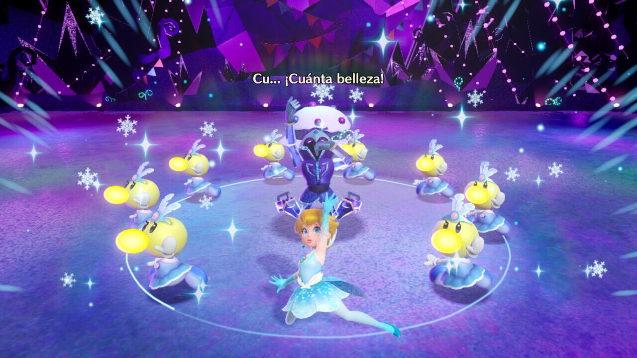 Eso sí, la banda sonora nos ha encantado: animadísima, variada, muy pegadiza y con varios temazos que juegan con muchísimo acierto con diferentes estilos musicales para adaptarse a la ambientación de cada nivel. Los efectos siguen la misma línea y no hay voces más allá de alguna que otra frase o palabra suelta de Peach, algo que resulta extraño en un juego tan orientado al público más joven, ya que obliga a los pequeños a leer los textos (en español, por supuesto) y probablemente tengan dificultades para seguir lo que se dice en cada escena con la velocidad de lectura que requieren.