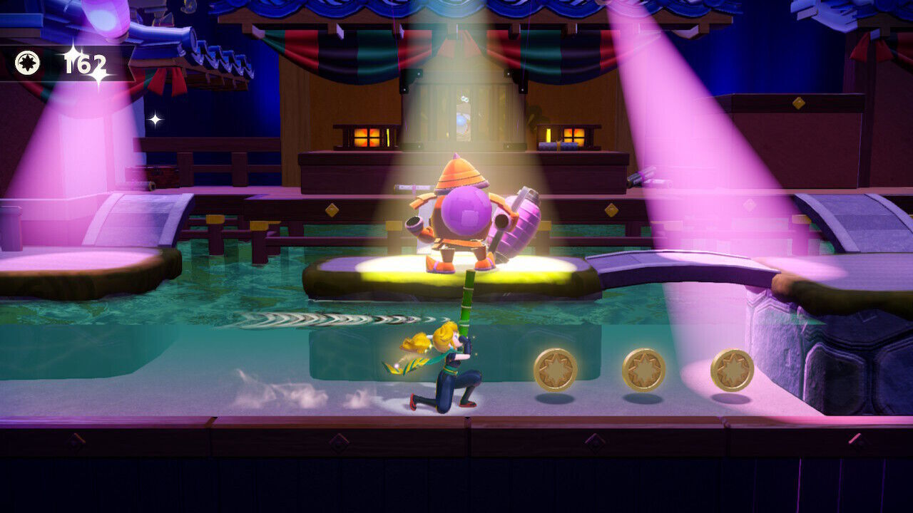 Al final, cuando mejor funciona el título es cuando deja que las plataformas cobren algo de protagonismo o añade alguna mecánica que nos requiere hacer algo más que simplemente aporrear un botón para eliminar enemigos que rarísima vez hemos visto intentando atacar. Un buen ejemplo de ello lo tenemos en las fases de Peach ladrona, las cuales, además de tener una puesta en escena fantástica, nos requieren que avancemos usando un gancho para sortear todo tipo de peligros, una mecánica que se usa también para plantear algún que otro pequeño rompecabezas. De igual modo, también nos han gustado mucho las pantallas de Peach Ninja, las cuales convierten la obra en una aventura de sigilo y plataformas muy ligera, pero que cumplen con su función de divertir. Y las de Peach vaquera, al basar sus combates en tener que agarrar cosas para usarlas como proyectiles, tienen algo más de "chicha" que otras como las de Peach Kung Fu o Peach Superheroína, donde simplemente nos bastará con machacar el botón de ataque para acabar con todos nuestros rivales.