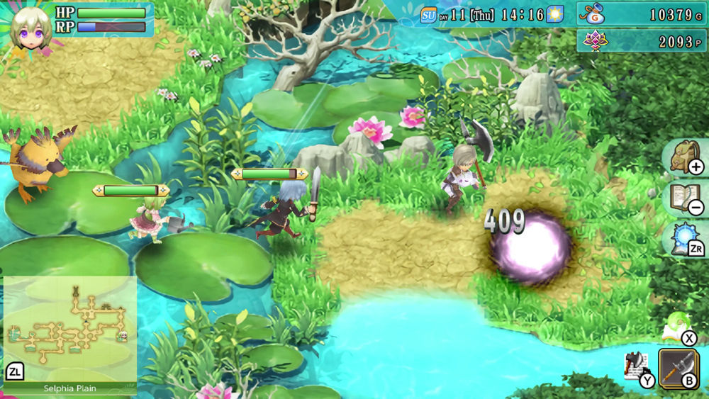 El huerto es el eje de todo, en el que tendremos que pasar muchísimo tiempo, mientras quitamos las malas hierbas, removemos la tierra, echamos nuevas semillas y regamos con sumo cuidado conforme pasan las estaciones. Plantas, verduras, vegetales y otros elementos más especiales crecerán y florecerán si somos cuidadosos y seguimos las instrucciones o consejos, así como nuestra propia intuición. Es muy satisfactorio recoger aquello que tanto sudor y esfuerzo virtual nos ha costado plantar, así como a veces frustrante al reconocer que hemos errado en algún paso y aquello que queríamos recoger no lo hace en su mejor forma o peor, no termina de crecer. Hablamos de un videojuego muy largo, en el que siempre habrá algo que hacer o incluso tendremos algún que otro contratiempo en nuestras cosechas o retos -el huerto es el que nos da acceso a las llamadas runas y mazmorras-, además no hay que olvidar que como futuros monarcas de Selphia debemos atender a numerosos eventos sociales e incluso convocar otros tantos, como festivales.