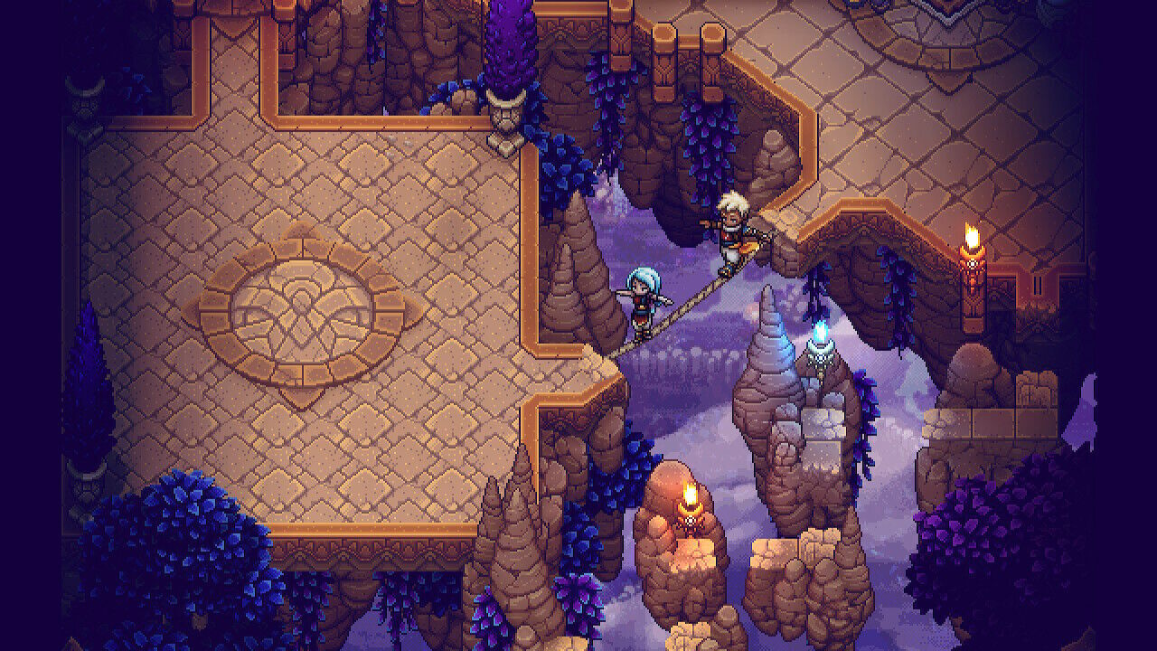 Por suerte, Sea of Stars no es solo divertido a la hora de pelear, ya que también consigue hacer de la exploración y el mazmorreo una experiencia muy gratificante. Si bien el avance por los escenarios suele ser bastante lineal, sus desarrolladores han sabido crear unos entornos muy dinámicos y con cierta verticalidad que nos harán interactuar constantemente con un buen número de elementos distintos, ya sea para escalar por paredes, hacer equilibrio sobre lugares estrechos, subir desniveles o lanzarnos desde cierta altura. Todo esto consigue que, de entrada, las mazmorras no transmitan la sensación de ser una simple sucesión de pasillos con monstruos, animándonos a estar pendientes a nuestro alrededor tanto para avanzar como para encontrar secretos que suelen estar escondidos de formas muy ingeniosas usando la perspectiva de la cámara.
