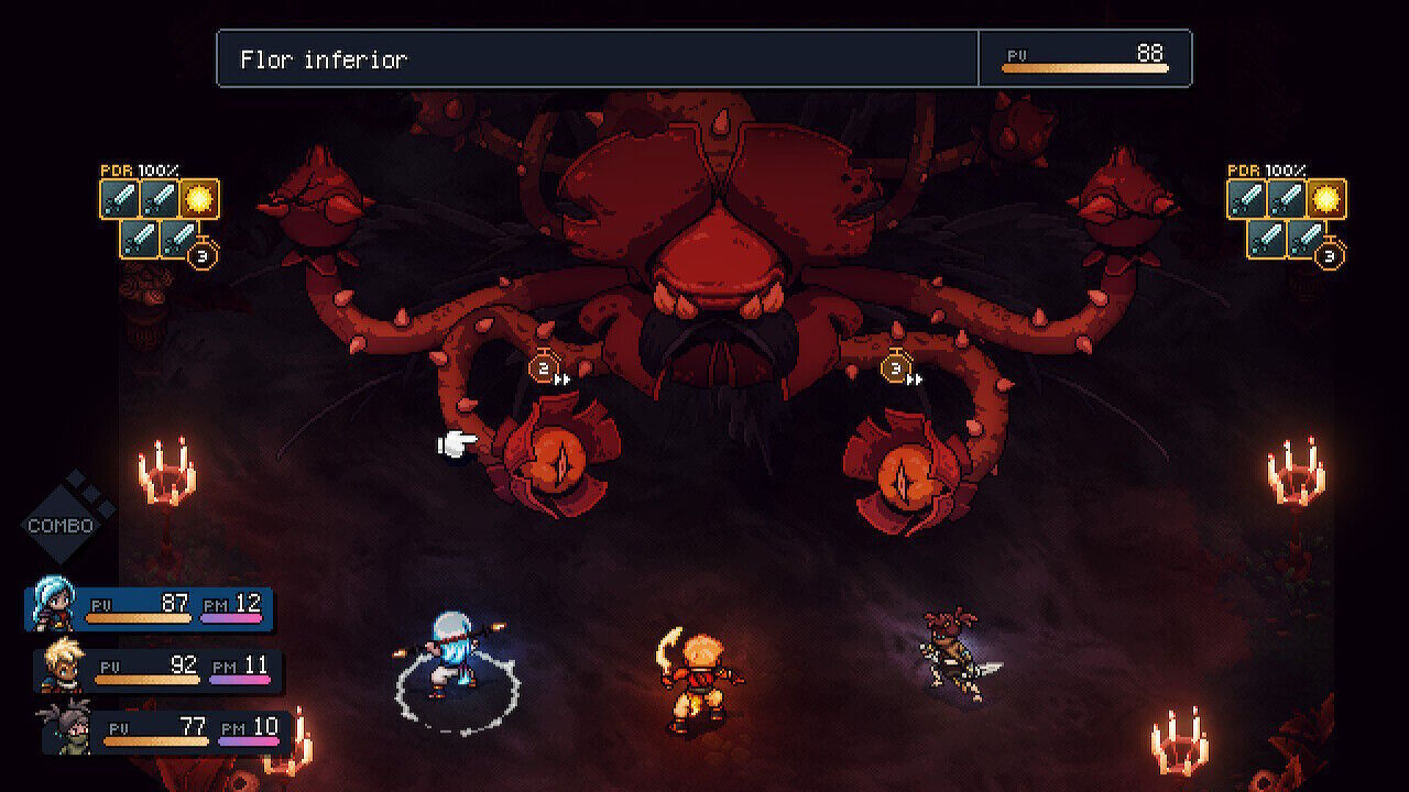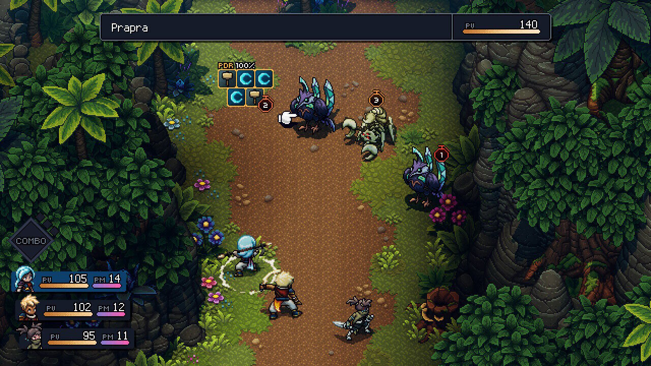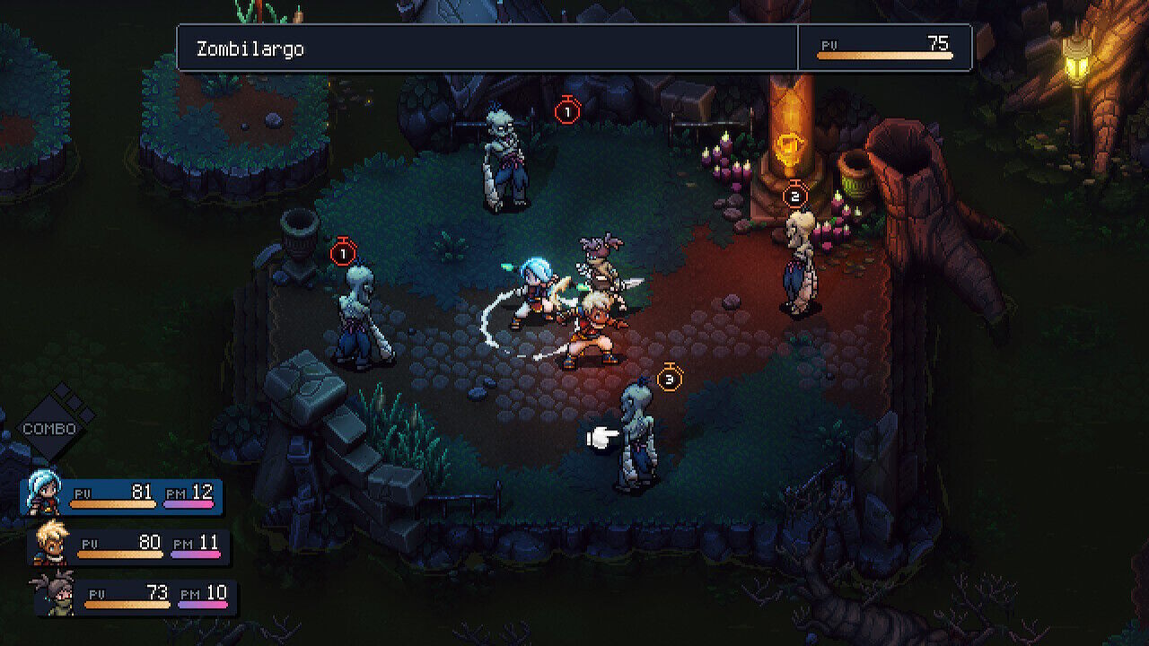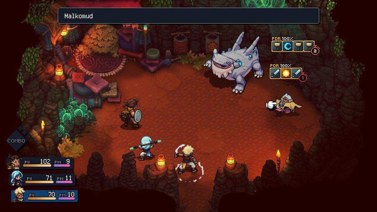 Ahora bien, Sea of Stars no vive solo de la nostalgia y si es un gran videojuego lo es por sus propios méritos, como bien demuestra, por ejemplo, su fantástico y divertidísimo sistema de combate. Aquí las batallas no son encuentros aleatorios, sino que veremos a los enemigos pululando por el mapa y el duelo comenzará cuando hagamos contacto con ellos. Y ojo, ya que las peleas tienen lugar en el mismo mapa por el que nos movemos, tal y como ocurría en Chrono Trigger, por lo que no nos transportarán a un escenario independiente, lo que ayuda muchísimo a aligerar las cosas al prescindir de transiciones entre la exploración y los combates.