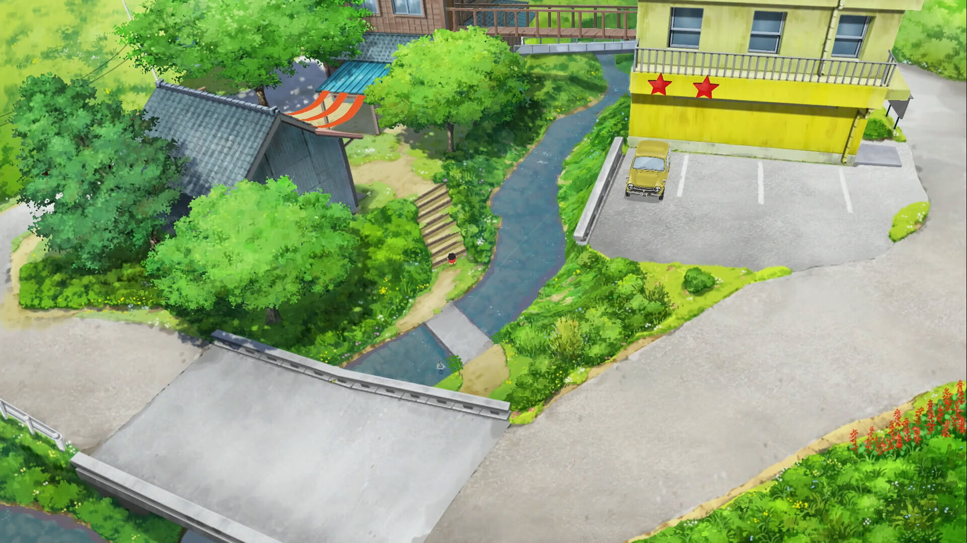 El apartado artístico hace mucho por enfatizar esa jugabilidad agradable y pausada, y también el tono nostálgico, rural y bucólico de la aventura. Es sin duda uno de los juegos más bonitos que hemos visto en la pantalla de nuestra Nintendo Switch, sobre la que se dibujan parajes naturales preciosos que parecen acuarelas. Son, eso sí, fondos prerrenderizados, y por lo tanto, estáticos, pero que cobran vida por la perspectiva utilizada y por el diseño de sonido. El juego nos muestra calles con flores en primer plano; y caminos donde el lugar central no lo tiene Shinnosuke, sino un puente coronado por un arcoiris. La naturaleza es la protagonista en la pantalla y, salvo en algunos momentos concretos, también en los altavoces. No suele haber música, sino que nos rodea el sonido de las cigarras, el chapoteo del agua del río, el viento meciendo las hojas… Todo ello consigue que nos teletransportemos a Asso.