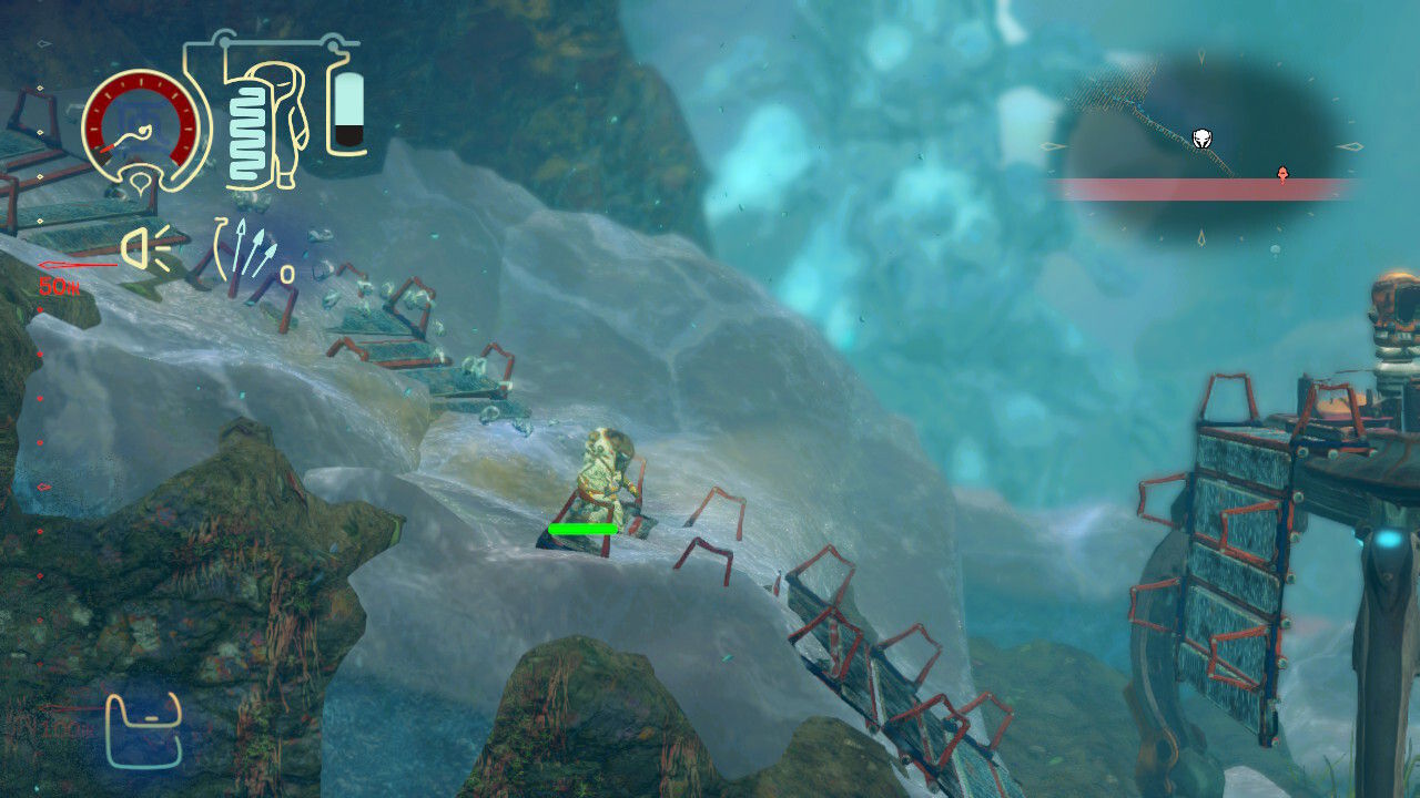 El problema es que conseguirlo no es precisamente sencillo, dado que tenemos que tener en cuenta diversos factores. Para empezar, los mencionados tanques son bastante delicados y pueden romperse si les sometemos a un golpe demasiado severo o, simplemente, si tras efectuar un salto, caemos al suelo con demasiado ímpetu. La presión tampoco es para tomársela a la ligera y si descendemos más de lo debido (algo delimitado por una clara línea roja que se muestra en el propio escenario), el traje sufrirá las consecuencias. El implacable hielo ya citado también es otro problema, y si a esto se suma la presencia de diversos animalejos acuáticos (algunos de ellos de origen robótico) no demasiado amistosos, las cosas no pintan demasiado bien para el pobre superviviente.