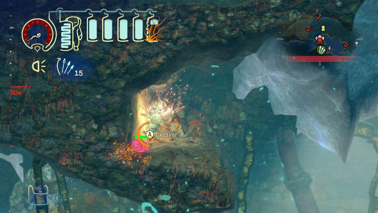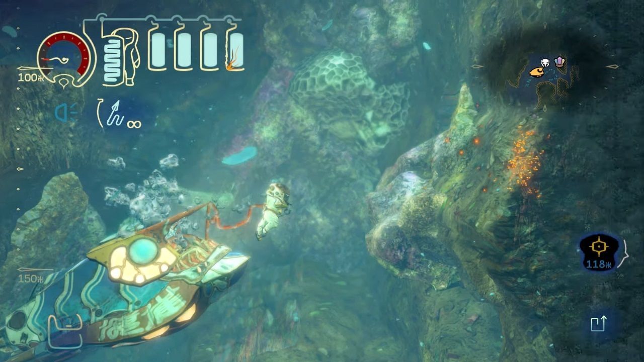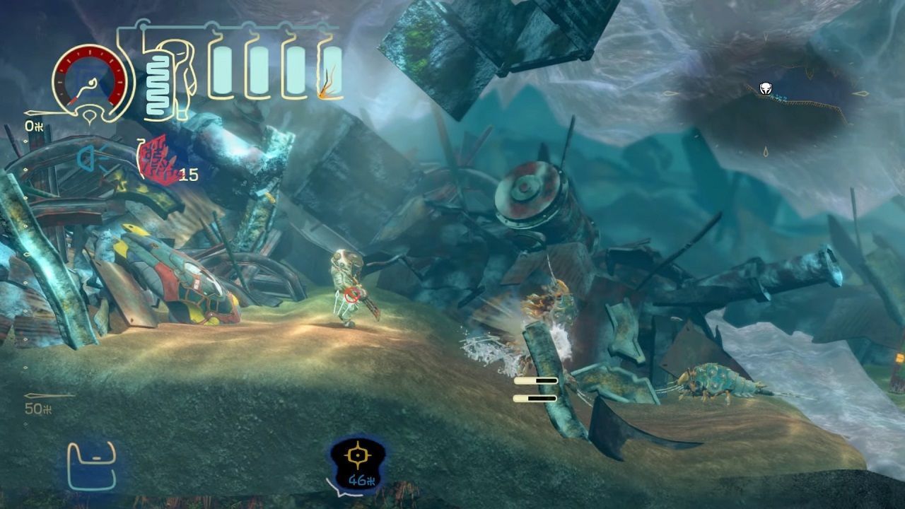Afortunadamente, es posible ir encontrando multitud de recursos como tanques de oxígeno extra así como diversos materiales que nos permiten fabricar distintos componentes. Y eso incluye desde armas a un buen número de mejoras para nuestro traje, desde mayor capacidad de almacenamiento a una superior resistencia. Este componente rolero se ve bien reforzado por otros elementos, como por ejemplo el backtrackeo, siendo posible regresar a zonas previamente visitadas con nuevas mejoras y habilidades que nos permitan avanzar y tomar rutas previamente inaccesibles. También es necesario acabar con ciertos rivales, jefes finales incluidos, si bien es cierto que dichos momentos de acción son menos frecuentes que en otros juegos similares, algo que gustará más o menos en función de los gustos de cada usuario.