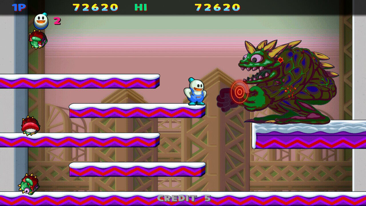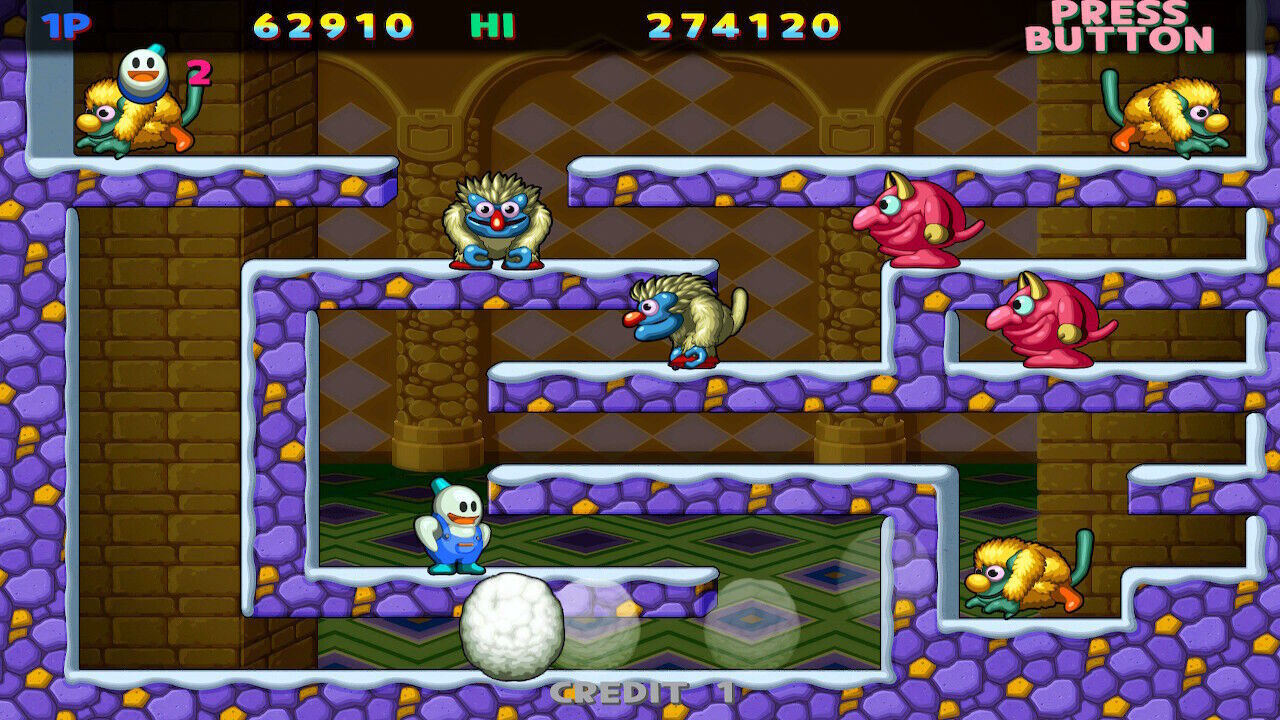 No queremos decir con esto que sea un mal videojuego, ni mucho menos, ya que la mecánica de crear y lanzar bolas de nieve es muy divertida y permite realizar técnicas avanzadas bastante interesantes para movernos por los niveles, ganar segundos de invulnerabilidad e incluso crear plataformas que nos permitan llegar a sitios inaccesibles, y todo ello por no hablar de lo entretenido que puede llegar a resultar en cooperativo, pero sí que es cierto que el paso de los años no lo ha tratado bien y ha hecho que se le vean mucho más las costuras que ya tenía en su momento, especialmente si lo comparamos con otros exponentes de la época como el propio Bubble Bobble, cuya capacidad de diversión sigue manteniéndose intacta gracias a un diseño de niveles infinitas veces más cuidado y equilibrado.