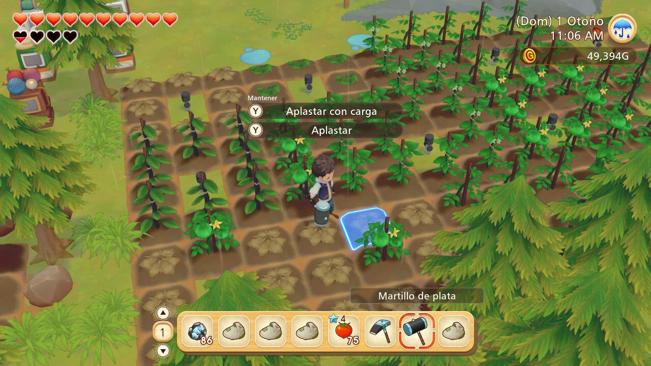 Como ya ocurría con el remake de Friends of Mineral Town del año pasado, aquí podremos empezar la partida en fácil o normal, haciendo la experiencia un poco más accesible para los nuevos jugadores el primero de ellos. Sin importar el que se elija, las novedades hacen que sea más fácil entrar que en anteriores Story of Seasons, aunque los inicios siguen siendo duros. Cuando llegamos a la granja todo está hecho unos zorros: bajo el bosque, la maleza, los charcos y el corral derruido antaño había, probablemente, una zona de cultivo bien arada y cuidada.