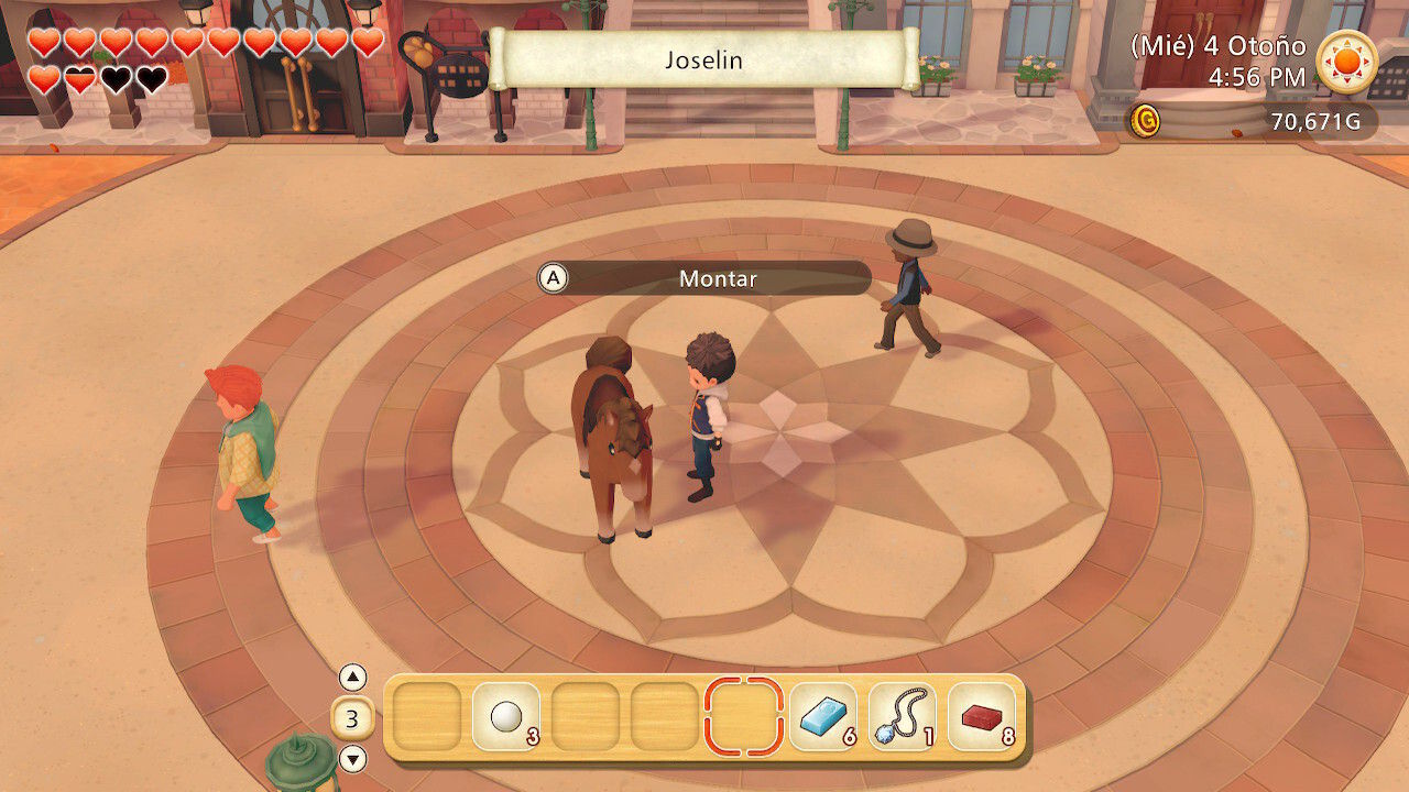 Cuando avanzamos en esas amistades se van desbloqueando escenas que aparecen al visitar ciertos espacios del pueblo (que por cierto, ahora podemos recorrer junto a nuestra mascota o sobre nuestra montura). Esas escenas, en ocasiones, nos permiten conocer más a esa persona, y en otras no son más que escenas costumbristas rodeadas de cierto humor. Igual que se hace pesado que en la mayoría de las ocasiones en las que hablamos con un olivense diga siempre la misma línea de diálogo, estas escenas podrían haber servido para crear una trama general interesante o para ofrecer una profundidad real a esos personajes que, en su mayoría, son muy planos y hasta un cliché con patas. Tampoco ayuda que un tema paralelo sobre la naturaleza que inmiscuye a duendes y espíritus del bosque quede desaprovechado: se podría haber ofrecido una trama interesante y se queda en algo relacionado con la jugabilidad que no queremos desvelar.
