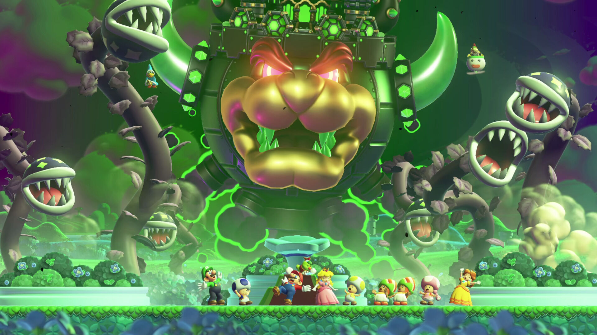 Por supuesto, otro de los grandes atractivos de esta nueva entrega lo tenemos en el regreso de su modo cooperativo local para hasta cuatro jugadores, pudiendo así disfrutar de toda la aventura junto a nuestros amigos y familiares, algo que, tal y como podréis suponer, multiplica la diversión. Ahora bien, conviene señalar que se han hecho algunos ajustes respecto a lo visto en títulos como New Super Mario Bros. Wii o Super Mario 3D World, ya que ahora no hay colisiones con otros jugadores, lo que elimina de un plumazo ese pequeño toque competitivo que tenían y que podía llegar a ser tan divertido como frustrante, especialmente cuando las fases se complicaban con plataformas que se derrumbaban o en las que solo cabía un único personaje.