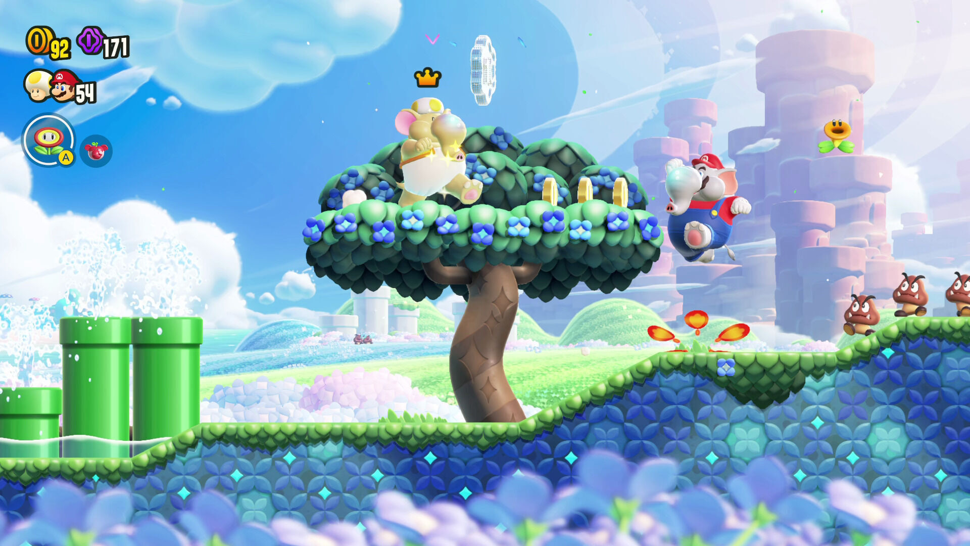 En cada pantalla hay escondida una de estas flores y al tocarla siempre ocurre algo que cambia por completo la dinámica de la fase que estemos jugando de formas completamente impredecibles. Eso sí, el efecto que ocurra depende del nivel en concreto en el que estemos, así que no es algo aleatorio. De este modo, puede ocurrir de todo, desde transformarnos en Goomba para afrontar una ingeniosa sección de sigilo hasta que las tuberías cobren vida, la perspectiva cambie o una estampida furiosa nos persiga a toda velocidad. Y estos son tan solo los ejemplos más básicos que podemos poner, ya que el título siempre está experimentando y superándose a sí mismo con ideas cada vez más transgresoras, originales, sorprendentes e inesperadas, lo que tiene más mérito todavía cuando nos damos cuenta de que cada pantalla tiene sus propios efectos exclusivos y que todos ellos son divertidísimos y aportan algo nuevo y refrescante a la saga. Una auténtica genialidad.