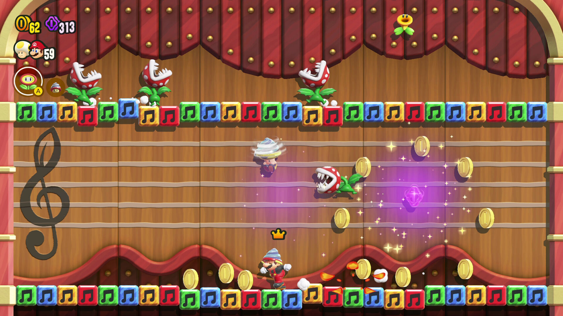 El sonido tampoco se queda atrás con una banda sonora muy animada, variada y que se comporta de forma dinámica para cambiar su instrumentación según nuestro estado o lo que suceda durante el nivel. No creemos que sus nuevos temas puedan competir con las melodías más legendarias y míticas de la serie, pero hay mucha calidad aquí y la mejora respecto a lo que escuchamos en las diversas entregas de New Super Mario Bros. es más que notoria, ambientando cada fase a la perfección y aportando un puntito extra de locura cuando las flores maravilla hacen acto de presencia. Los efectos, por cierto, nos han parecido incluso mejores que la propia música: hay infinidad de ellos y tienen un protagonismo gigantesco en el desarrollo de los niveles, aportándonos muchísima información sobre lo que está sucediendo y creando una armonía perfecta entre imagen, sonido y jugabilidad.