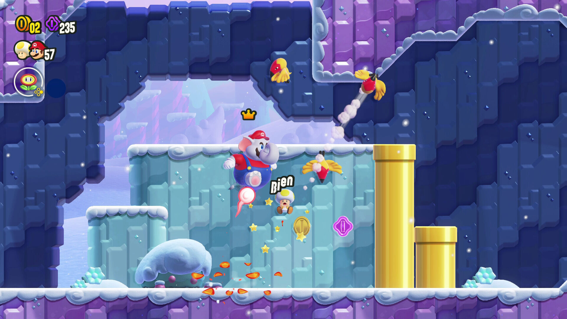 Lo que sí que nos ha gustado bastante son las nuevas transformaciones que se han incluido para Mario y compañía gracias a la introducción de tres objetos potenciadores inéditos: la Elefanzana, la Flor Burbuja, y el Champitaladro. No son muchas, pero todas ellas son divertidísimas y las pantallas saben sacarle bastante partido de formas muy ingeniosas, incluyendo pequeños puzles y secretos que solo podremos conseguir usándolas.