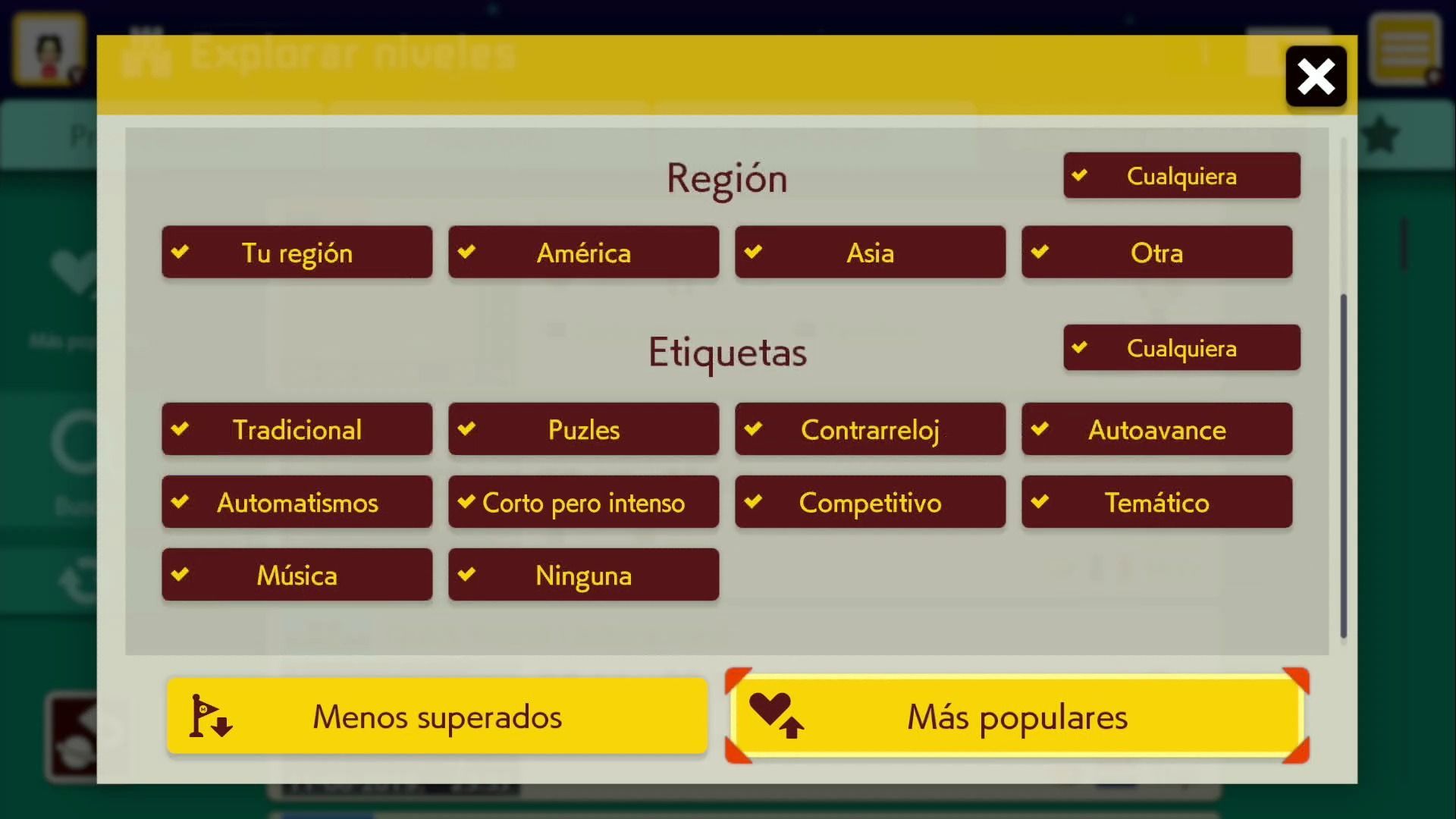 Por ejemplo, si queremos jugar niveles con scroll automático podremos seleccionar la etiqueta "Autoavance" en el buscador para que nos aparezcan todas las pantallas que hayan sido catalogadas con ella, además de otras opciones con las que podremos ser mucho más específicos. De igual modo, si no queremos comernos demasiado la cabeza, Nintendo siempre nos mostrará los niveles más populares, recientes y "prometedores" sin necesidad de hacer búsqueda alguna.