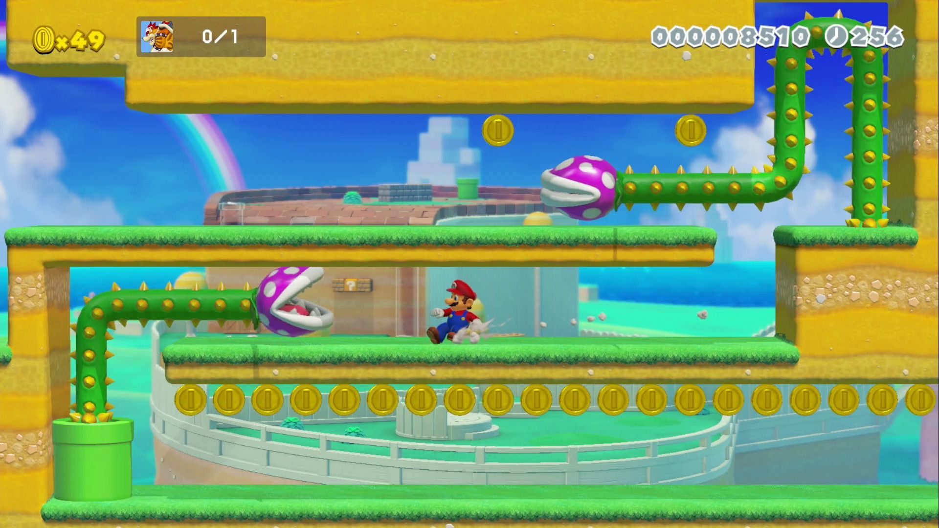 Hablando de esto último, nos tocará superar pantallas basadas en Super Mario Bros., Super Mario Bros. 3, Super Mario World, New Super Mario Bros. y, la gran novedad de esta secuela, Super Mario 3D World. Al igual que en su predecesor, cada uno de estos estilos cambiará por completo los controles, las físicas, los movimientos que podemos realizar y los distintos elementos, potenciadores, enemigos y mecánicas que encontraremos, ajustando así la jugabilidad a lo visto en las diversas aventuras del fontanero.