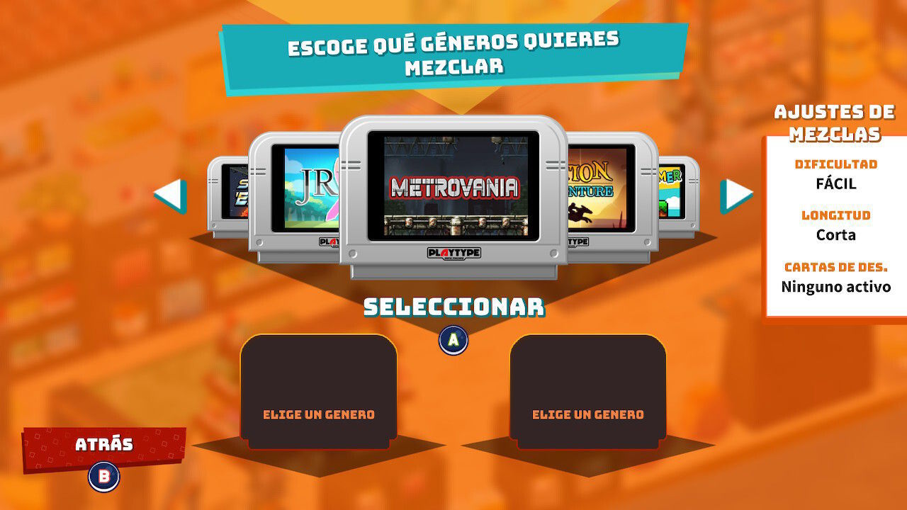La aventura arranca cuando dos hermanos montan una tienda de su gran pasión, los videojuegos, lugar que por cierto se convierte en una especie de minihub para el juego. Y es que en dicho establecimiento es posible desde dialogar con los clientes (en español) a echar un vistazo a los marcadores, a las cartas que vamos coleccionando y de las que en un instante os hablaremos y demás tareas básicas. Pero la verdadera protagonista de esta producción es una consola ficticia llamada Playtype Game Machine. Un dispositivo que posee la particularidad de que puede ser cargado con dos cartuchos a la vez, lo cual da forma a la idea que los desarrolladores tenían en mente cuando diseñaron este título: unir dos estilos de juego en uno y generar aventuras aleatoriamente.