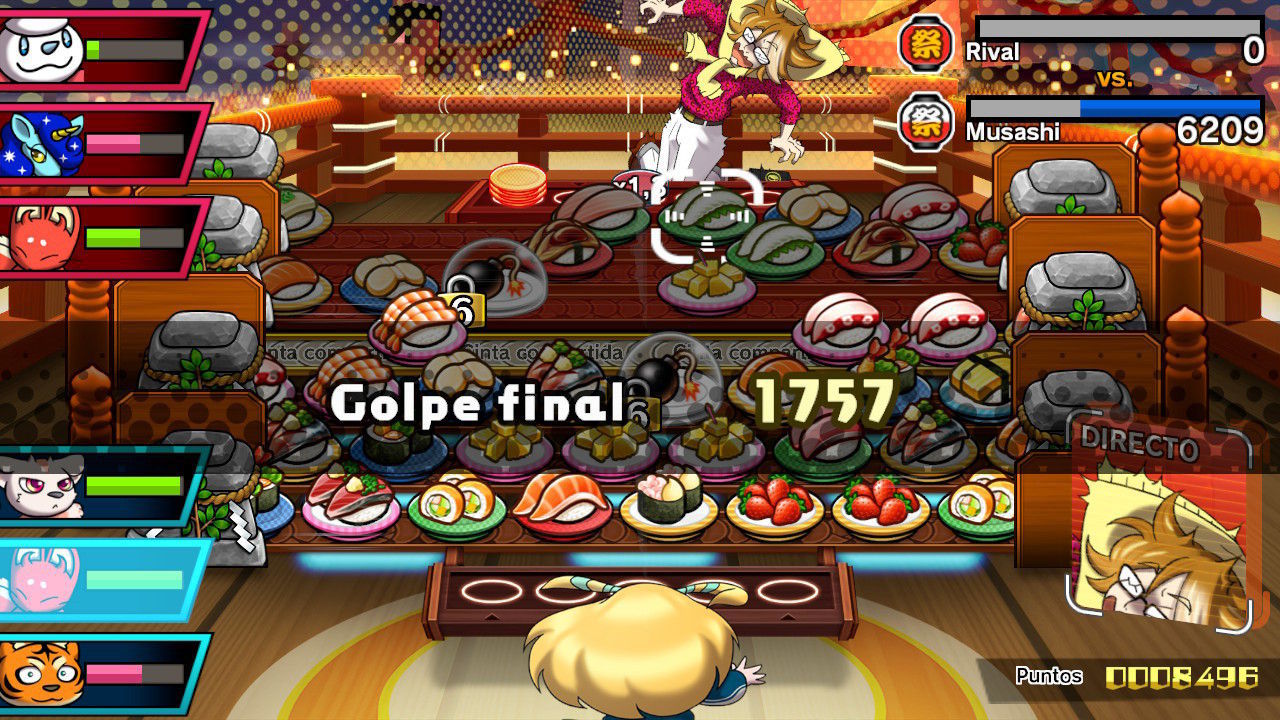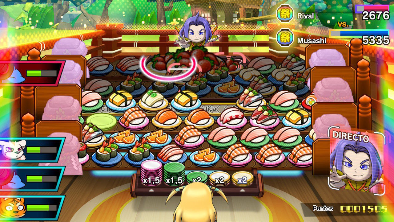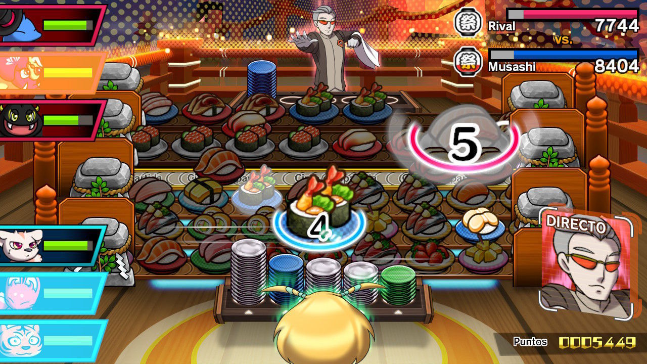 En lo puramente jugable tenemos un juego de puzles centrado en los combates contra otros jugadores o contra la IA, de modo que para alcanzar la victoria nos tocará reducir la barra de vida de nuestro rival a cero. ¿Y cómo hacemos esto? Muy fácil, enlazando platos de sushi de igual color para acumular pilas de los mismos y lanzarlas como potentes proyectiles que dañen a nuestro adversario.
