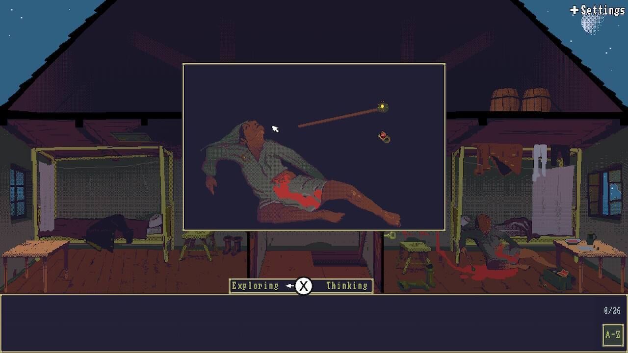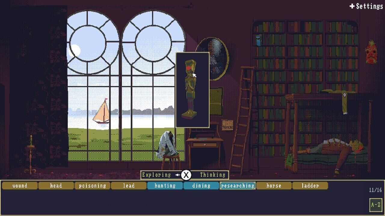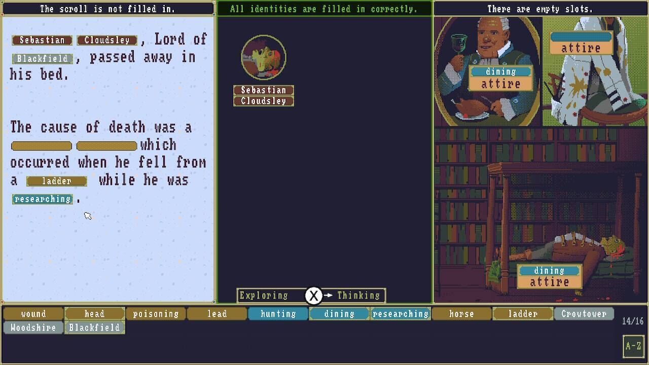 Aunque no es un juego de texto, The Case of the Golden Idol se basa en las palabras: cada objeto o personaje con el que podemos interactuar puede tener (o no) una serie de palabras subrayadas que podemos sustraer para quedarnos en un glosario con el que después tendremos que rellenar el informe del caso. Nombres, verbos, objetos, ubicaciones… Todo lo que podamos rapiñar servirá (o no) para dar forma a la respuesta de cada situación, que se acaba desvelando más como una descripción de lo que vemos que como una resolución real de los crímenes.