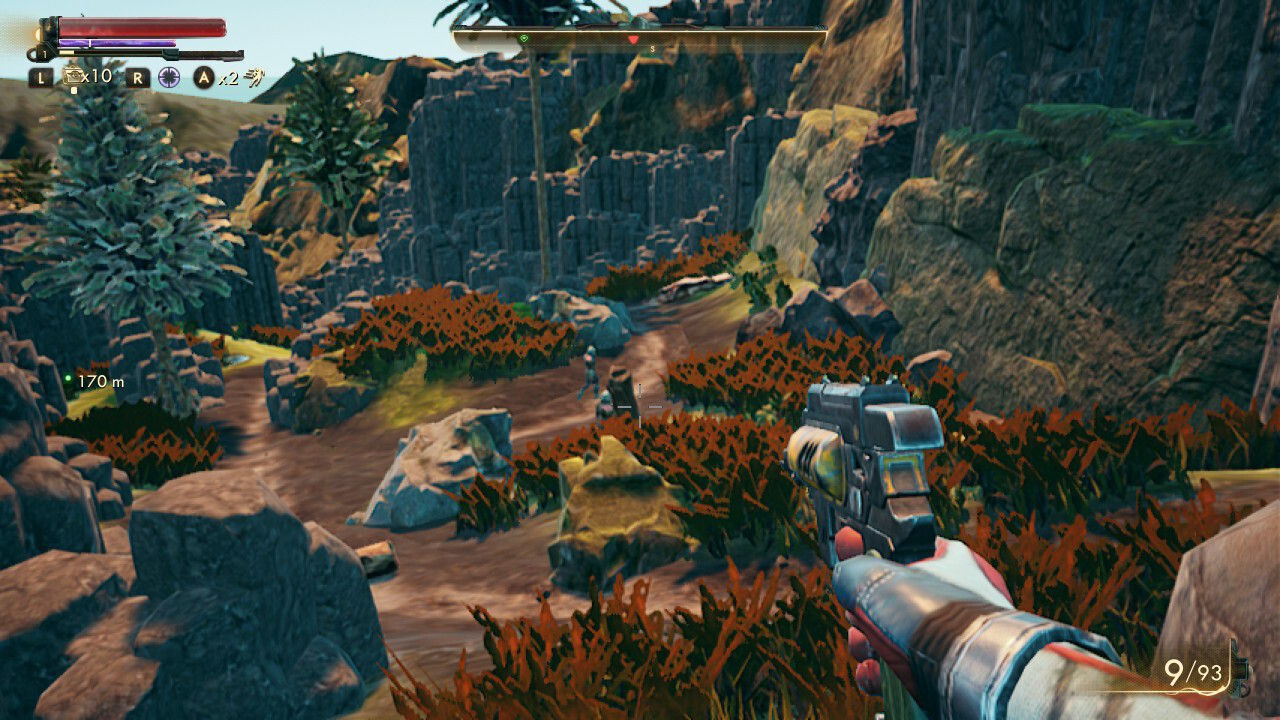 El rendimiento también se ve afectado al andar por las zonas salvajes de los planetas. El juego funciona a 720p en modo portátil y a 1080p en modo televisión, siempre con la aspiración de ejecutarse a 30 fotogramas por segundo. Pero se queda en eso, aspiración. Mientras que en las ciudades parece que el rendimiento se mantiene estable, hay una diferencia notable cuando exploramos, digamos, La Pionera (una estación espacial) y la superficie de Monarca. En el primer caso puede haber alguna bajada de frames al entrar en la zona de las tiendas, repleta de personajes, neones y efectos lumínicos; en el planeta mencionado, los fps bajan tanto que a veces complica la exploración, y sobre todo, los combates en los que nos podamos ver envueltos – en entornos cerrados, los enfrentamientos tienen algún bajón eventual, pero nada grave. Por suerte, gran parte del juego lo pasaremos en distintos lugares o niveles, y la superficie del planeta se dejará, mayormente, como lugar para transitar de un sitio a otro.