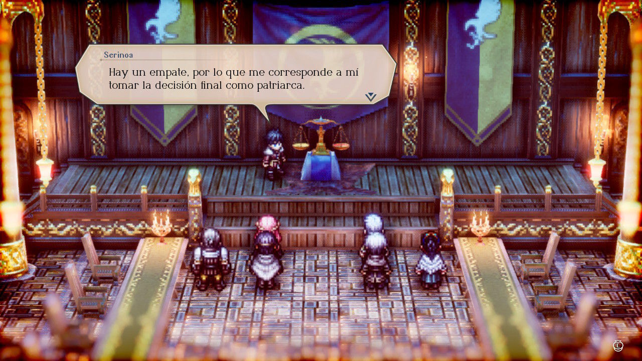 Eso sí, no todo en la historia de Triangle Strategy es digno de aplauso. Al ritmo lento que comentábamos al principio, a los personajes cliché y a algunos giros de guión que se sacan de la manga hay que sumar los diálogos: el guion (es decir, la sucesión de acontecimientos) es bueno, pero las conversaciones están repletas de redundancias, de explicarnos lo mismo o lo obvio una y otra vez. Es algo a lo que lamentablemente estamos acostumbrados en el videojuego, pero que no por ello hay que dejar de criticar.