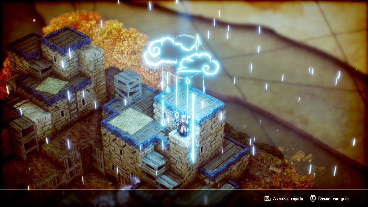 Todo ello está rodeado de efectos lumínicos, de sombras y de reflejos modernos: la luz entrando por una vidriera, la magia eléctrica afectando a los charcos… Sin embargo, hay fallos aquí y allá. Los entornos, construidos como dioramas sobre el mapa de Norselia, se pueden rotar durante las batallas y las pesquisas, pero la cámara a veces hace movimientos extraños, los escenarios en ocasiones ocultan a un enemigo y el movimiento libre de Serinoa en las fases de exploración es un tanto impreciso: parece que va flotando por el escenario.