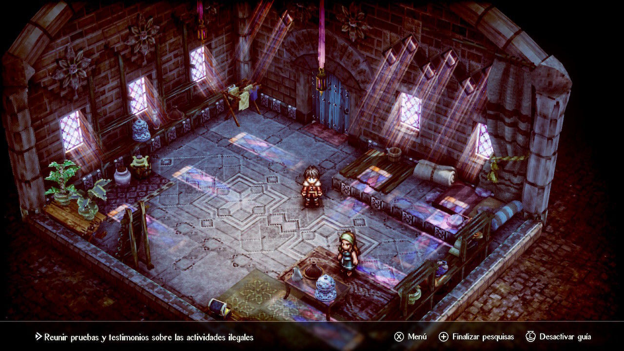 Triangle Strategy es un juego precioso, llevando más allá el estilo artístico HD-2D estrenado en Octopath Traveler y que se volverá a utilizar próximamente en Dragon Quest 3 HD-2D Remake. Los sprites de los personajes son detallados y en ciertos casos muy expresivos, y la ilustración de cada uno de ellos (siempre a mano con la pulsación de un botón, algo útil para recordar quién era tal o cual personaje que llevábamos unas horas sin ver) es increíble. Los escenarios, tridimensionales pero con un estilo pixelado, no son muchos ya que la trama vuelve una y otra vez a los mismos entornos, pero estos están repletos de detalles, sobre todo los hogares de las ciudades y los espacios cerrados, decorados con atención.