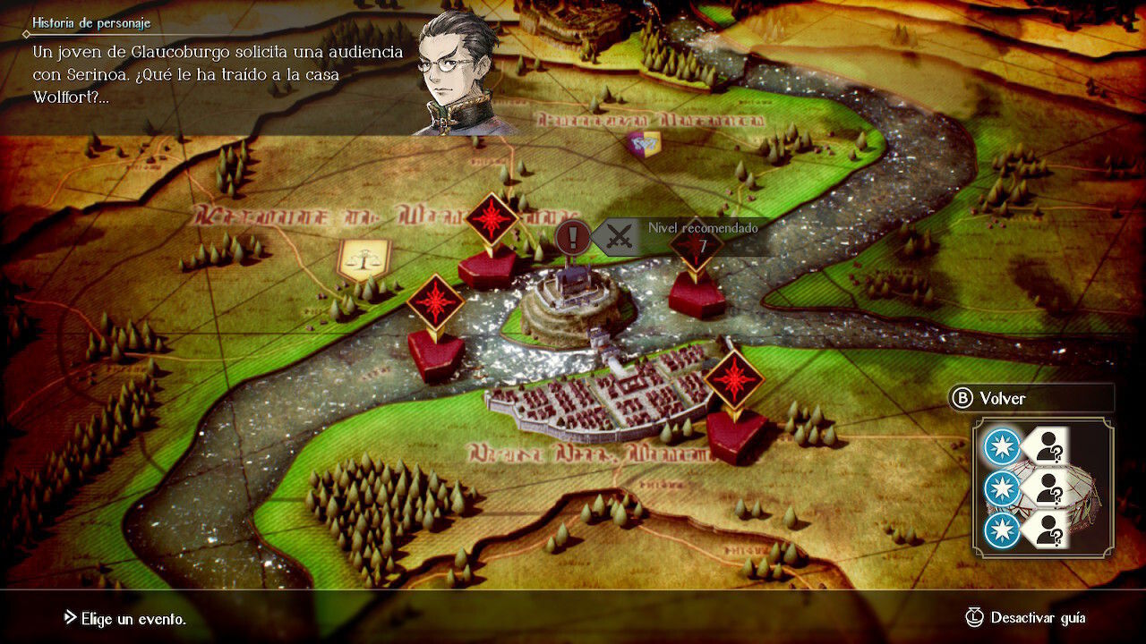 Aun así, eso no nos ha detenido a volver a Norselia tras acabar la primera partida tras unas 30 horas de juego (pueden ser más o menos si se usa el avance rápido, si se pasa de las conversaciones secundarias, si uno se detiene mucho en las pesquisas…) ya que Triangle Strategy claramente quiere que le des al menos una vuelta más tomando otras decisiones, para lo que pone sobre el tablero varios sistemas jugables para hacerlo más llevadero. Al hacerlo no solo visitas nuevos escenarios, conoces a otros personajes, alternas los diálogos y ves puntos de vista alternativos del conflicto, sino que te das cuenta de la estructura circular del guión, de cómo frases en las que no habías reparado demasiado en la primera vuelta tienen otro sentido cuando ya conoces ciertos hechos.