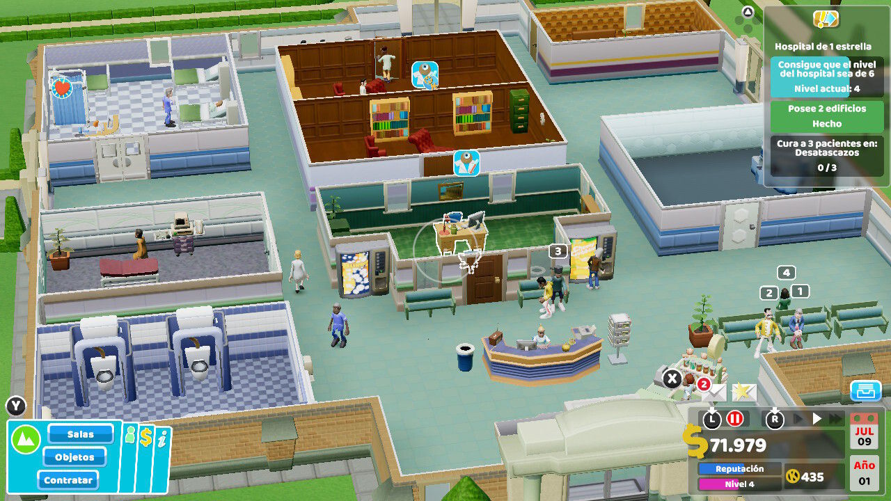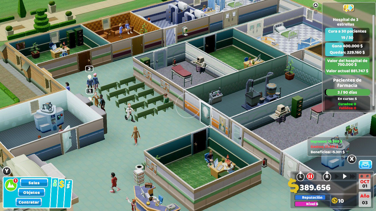 En este aspecto, el juego durante sus primeras horas hace las funciones de tutorial extendido, sí, pero sin resultar pesado, aburrido o tratar como tonto al usuario. Pronto comprenderemos a cómo crear una estructura sólida de habitaciones y servicios en el hospital, ubicar con inteligencia cada dependencia, formar a los profesionales que necesitemos o incluso dar prioridad a según qué tratamientos y diagnósticos a fin de evitar largas colas de pacientes en el ambulatorio.