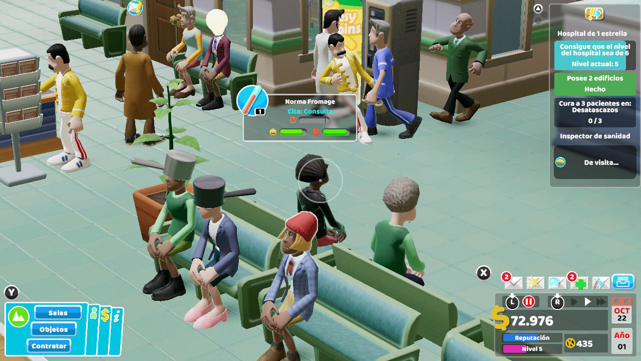 ¿Qué tipo de gestor queremos ser? ¿Buscamos profesionales dignos y costosos o contratamos y nos conformamos con los más baratos? ¿Preferimos obtener dinero rápido y fácil u ofrecer una atención sanitaria de calidad a los pacientes? Es cierto que, pese a que queramos otorgarle lecturas más profundas, Two Point Hospital es un videojuego, y como tal, tenemos objetivos que resolver, y escenarios predefinidos que solventar con las herramientas prefijadas. Cada hospital tiene sus propios retos y desafíos, con condiciones específicas y especiales que nos ofrecerán múltiples peculiaridades en las partidas. Los localizados en zonas de esquí tendrán mayor afluencia de fracturas y requerirán de calefacción, mientras que aquellos que reciban personas con problemas psicológicos -hay una patología que hace que todos vayan como Freddie Mercury por las salas de espera-, necesitarán de divanes y consultas de tratamiento mental. Principalmente hablamos de dinero y otros objetivos monetarios, pero el juego intentará que, más allá de salir airosos en las inspecciones del sanidad, seamos capaces de elevar la calidad o las estrellas de nuestro centro hospitalario, un aspecto en el que entran también los kudos, unos puntos especiales con los que podemos desbloquear objetos decorativos o de mejoras para las instalaciones.