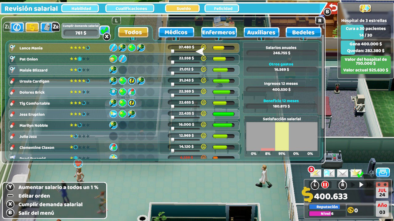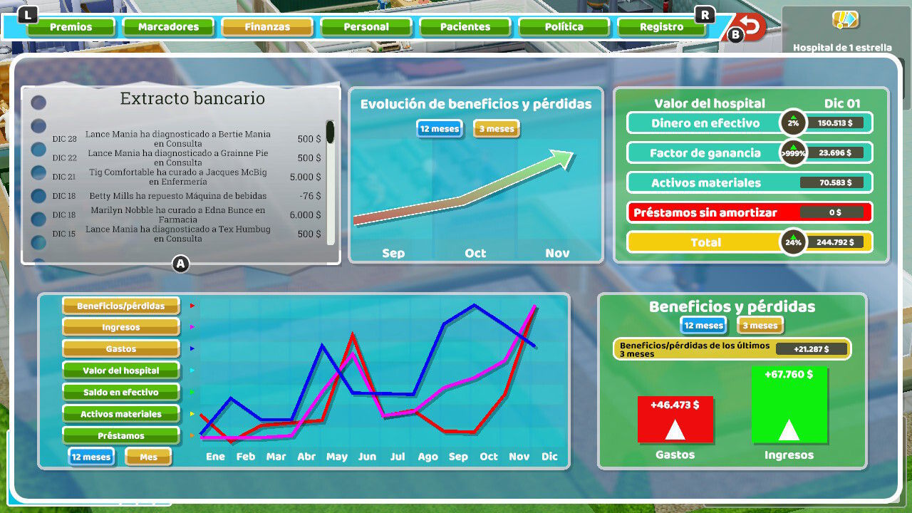 Por eso hay que destacar que, sea cual sea la estrategia que decidamos seguir, nos divertiremos. Todo está bien diseñado, calibrado y ajustado en el videojuego, pues recogiendo el testigo del Theme Hospital original, siempre que iniciemos una partida tendremos la sensación que todo o casi todo, puede estar bajo nuestro control. Cada decisión, acto o elemento en el que decidamos intervenir, tendrá una repercusión directa o indirecta en los eventos del futuro. Todo está bien explicado y jerarquizado, y casi cualquier cosa que veamos o tengamos a nuestro alcance en los menús del juego, tiene su sentido en la big picture del videojuego. Creednos cuando os decimos que, si buscáis una experiencia similar a la del clásico de Bullfrog, la encontraréis.