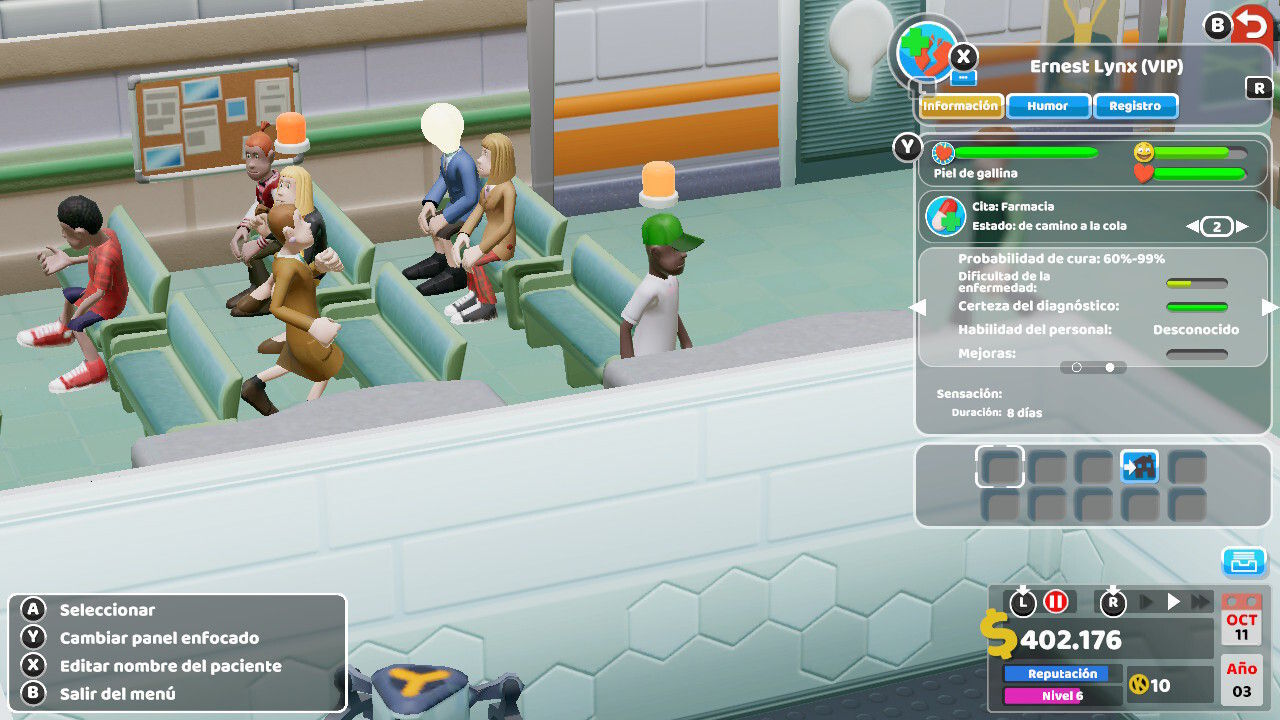 Todo lo dicho hasta la fecha podría ser una cuestión baladí si hablásemos de un mal port o de una conversión poco recomendable del juego de PC a consolas: no es el caso. El videojuego esta muy bien adaptado a cada uno de los sistemas, con una especial atención a Nintendo Switch, versión que hemos analizado en esta ocasión. Los menús son casi un calco de los vistos en PC, pero llevados a la navegación con pad o controles y mandos. En el caso de la consola de Nintendo, es fácil saltar de un menú a otro pulsando apenas un botón, una cosa que agradecemos, y que nos evita estar dando vueltas cuando la situación es prioritaria. Two Point Hospital es un juego en el que la reacción es primordial, tanto para construir como para ordenar y gestionar, y gracias a la distribución del menú, creemos que se logra una experiencia similar a la de PC. También nos ha gustado la fuente de letra, tanto en el modo portátil como en la pantalla grande a través del dock -aunque en la versión que hemos probado, antes del parche del día 1, se pueden dar fallos de distribución en la tipografía y el tamaño-, y la traducción, completamente adaptada al español.