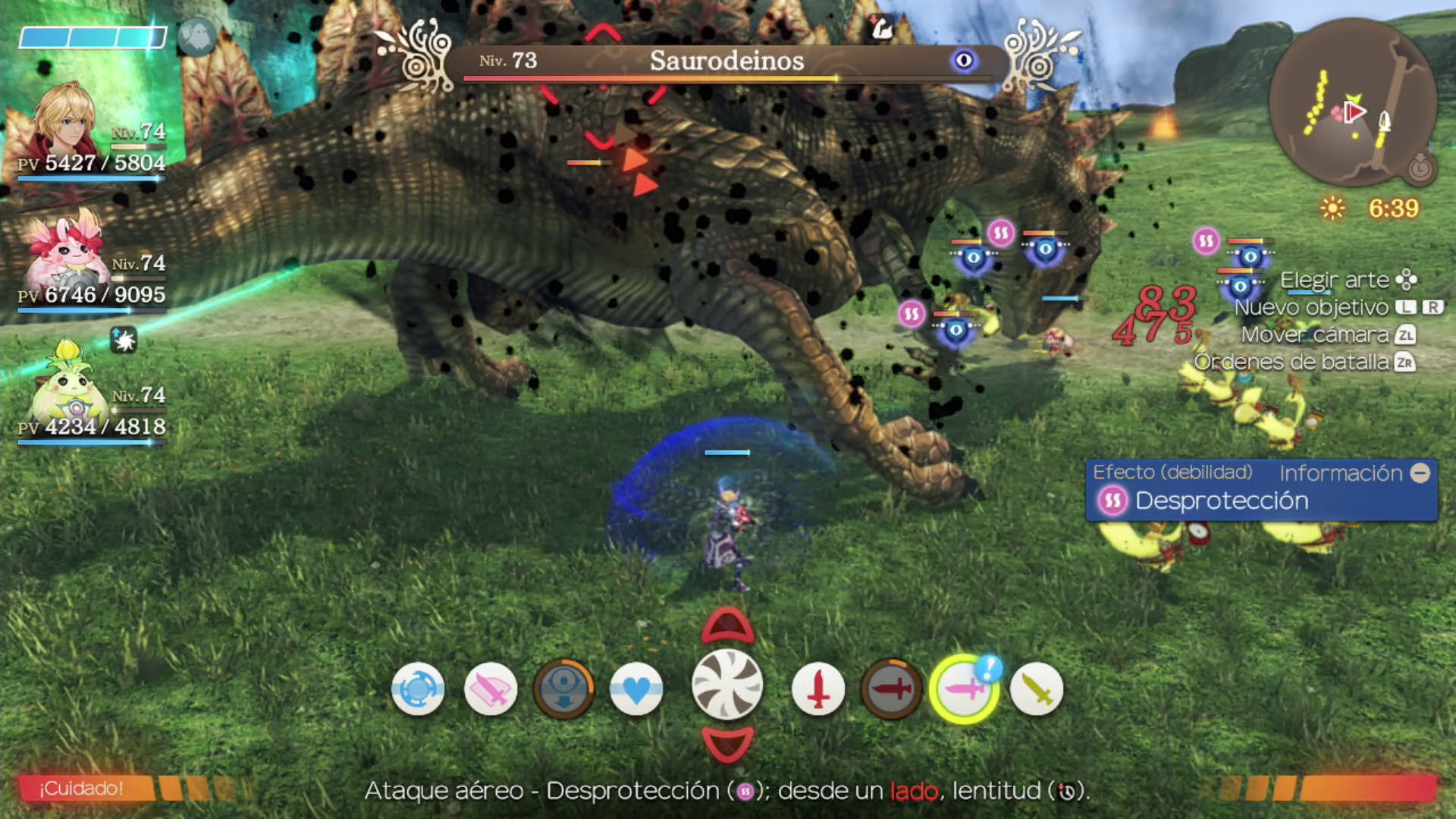 Algo parecido nos ocurre con su sistema de combate, demasiado simplificado respecto al juego principal, con menos opciones de personalización (se pierden los poderes), la imposibilidad de ver el futuro y el cambio de los ataques en cadenas por un simple movimiento especial con diferentes efectos que gana en potencia y efectividad según el número de nopón que hayamos reclutado para nuestra causa en una serie de misiones secundarias. Estos pequeños personajes no son jugables, pero nos seguirán a todas partes y nos darán apoyo de diferentes formas, ya sea curándonos, fortaleciéndonos o incluso atacando, de modo que cuantos más reclutemos, más fáciles nos resultarán los enfrentamientos.