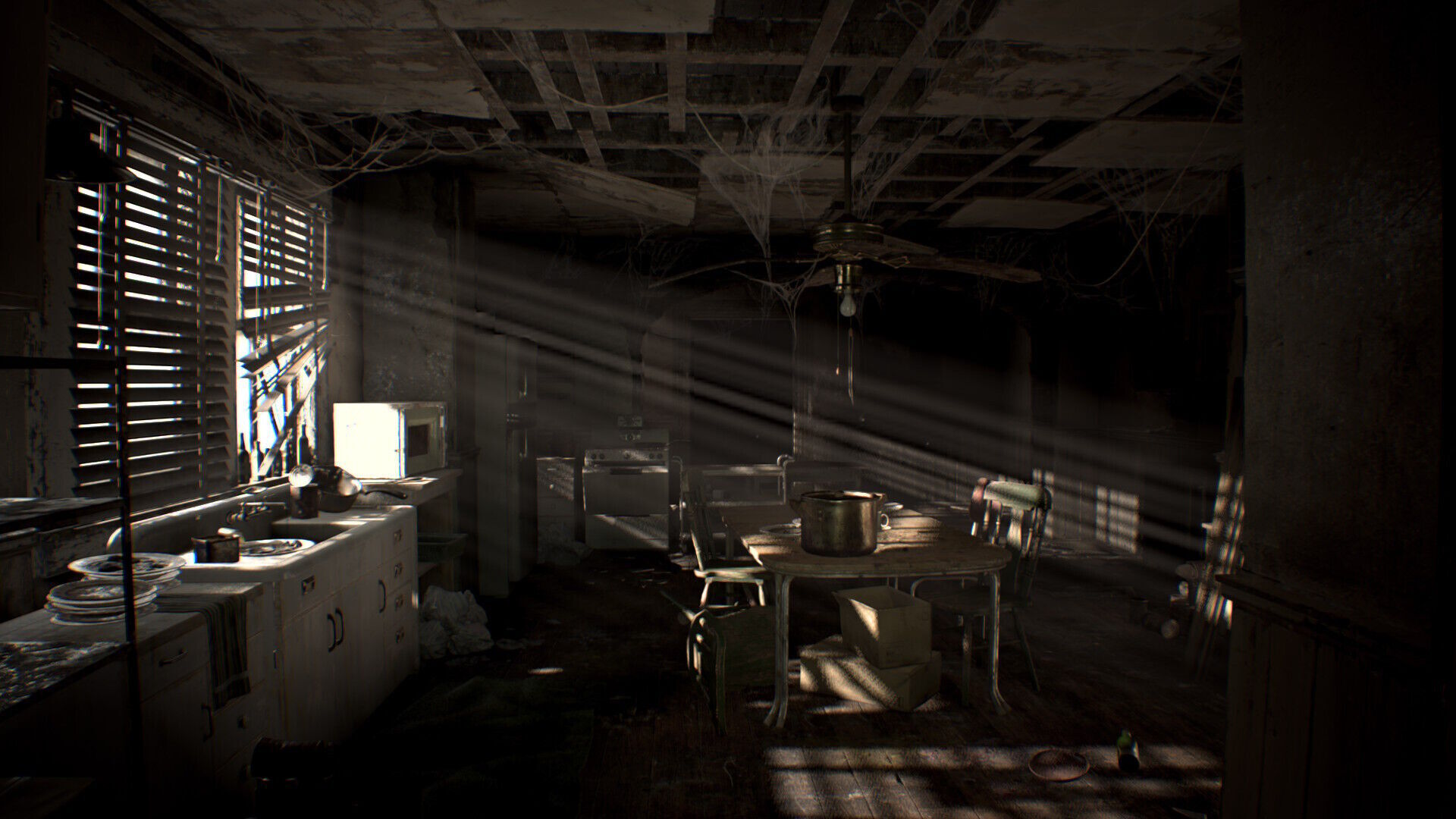 La iluminación de Resident Evil 7 era genial en su día y lo sigue siendo aquí: sorprende cómo se cuela la luz del atardecer por unas cortinas mal cerradas y cómo las velas colorean un salón en penumbra. Pero si nos ponemos quisquillosos, hay detalles en los que fijarse que ya estaban en la versión original del juego, como que los reflejos en el agua tiemblan un poco, que la vegetación genera sombras un tanto borrosas y que los espejos no muestren al protagonista.